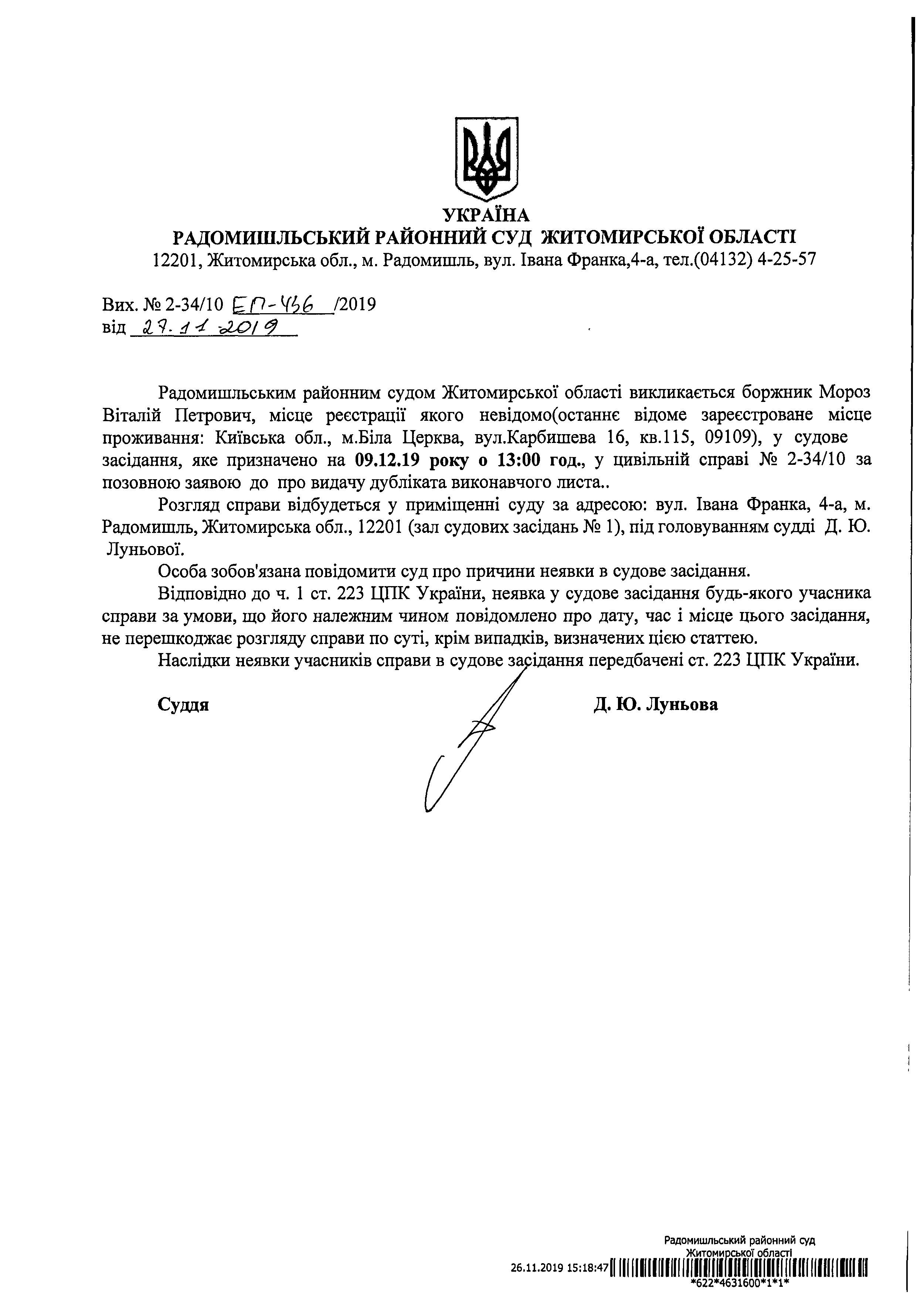 Оголошення про виклик до суду Мороза Віталія Петровича у цивільній справі № 2-34/10 за позовною заявою до про видачу дубліката виконавчого листа