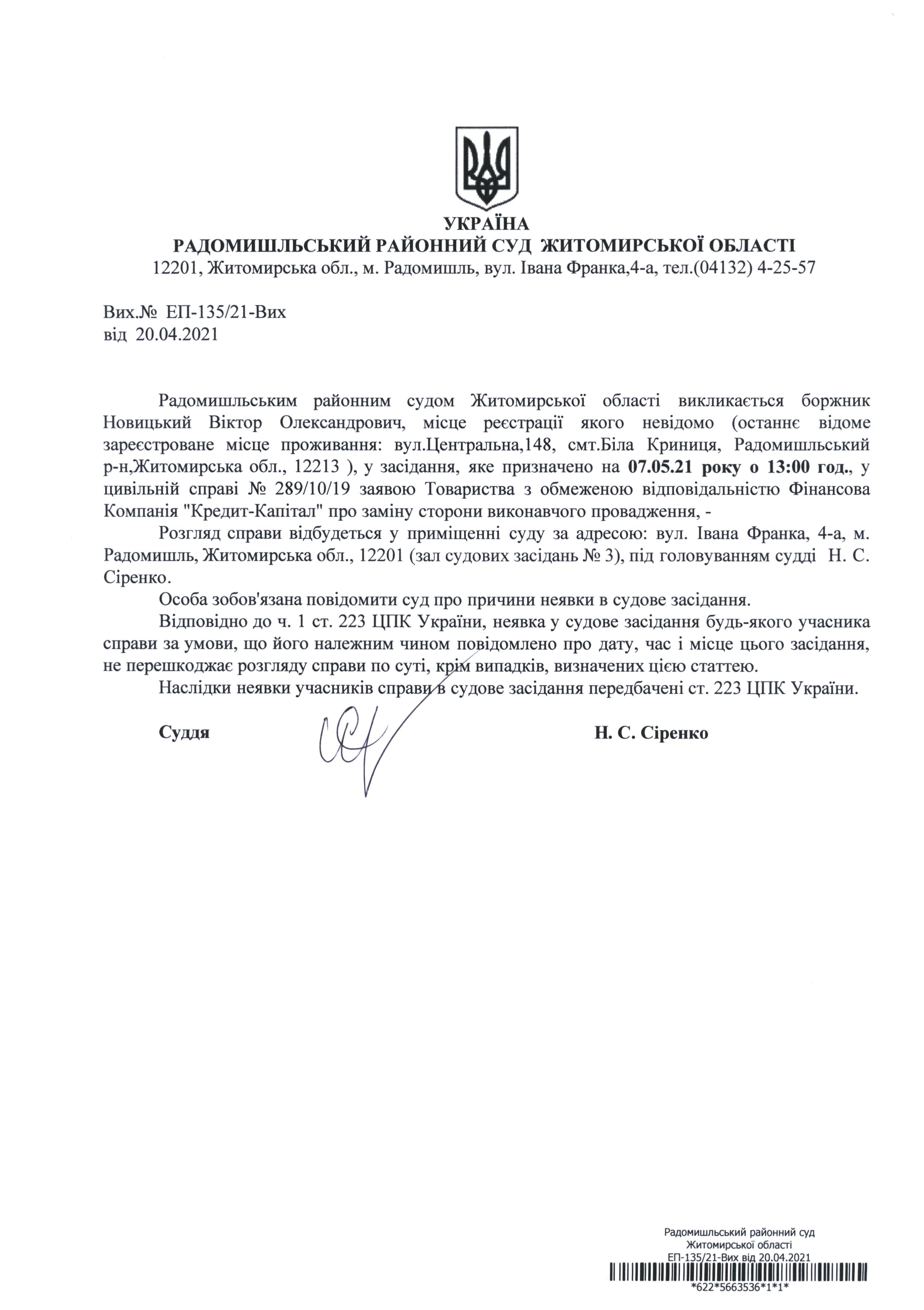 Оголошення про виклик до суду Новицького Віктора Олександровича у цивільній справі № 289/10/19 заявою Товариства з обмеженою відповідальністю Фінансова Компанія "Кредит-Капітал" про заміну сторони виконавчого провадження
