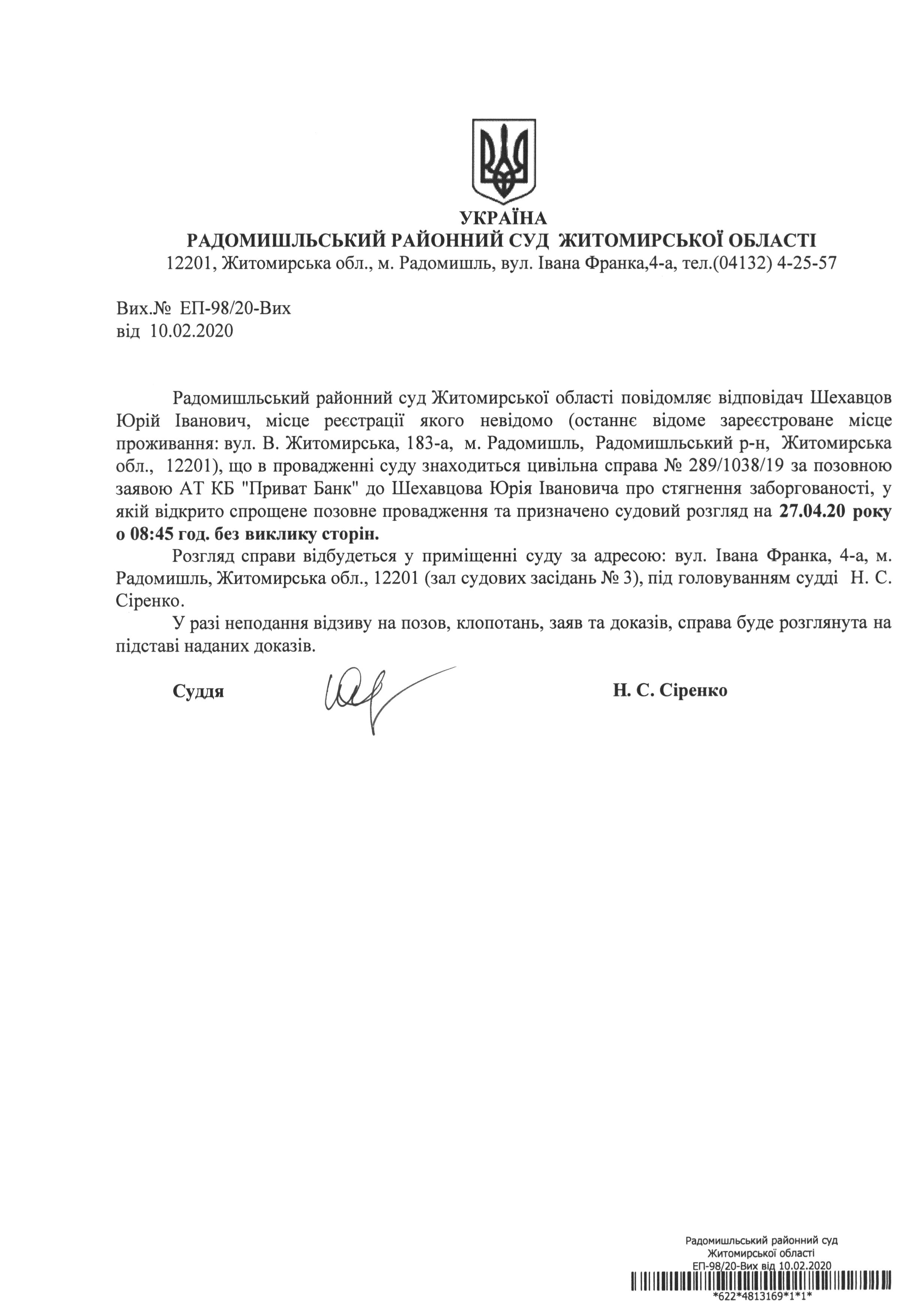 Оголошення про розгляд цивільної справи № 289/1038/19 за позовною заявою АТ КБ "Приват Банк" до Шехавцова Юрія Івановича про стягнення заборгованості