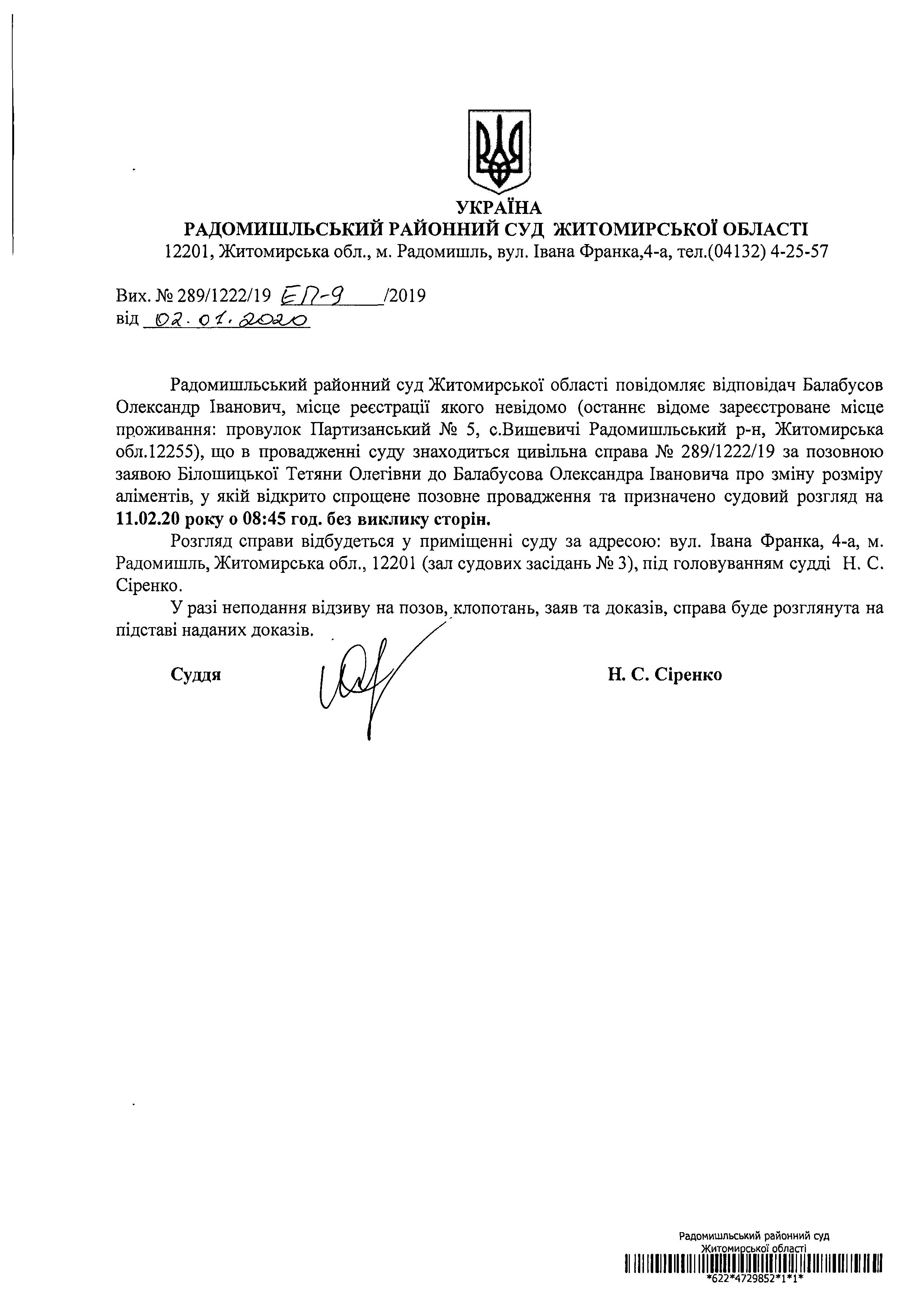 Оголошення про розгляд цивільної справи № 289/1222/19 за позовною заявою Білошицької Тетяни Олегівни до Балабусова Олександра Івановича про зміну розміру аліментів