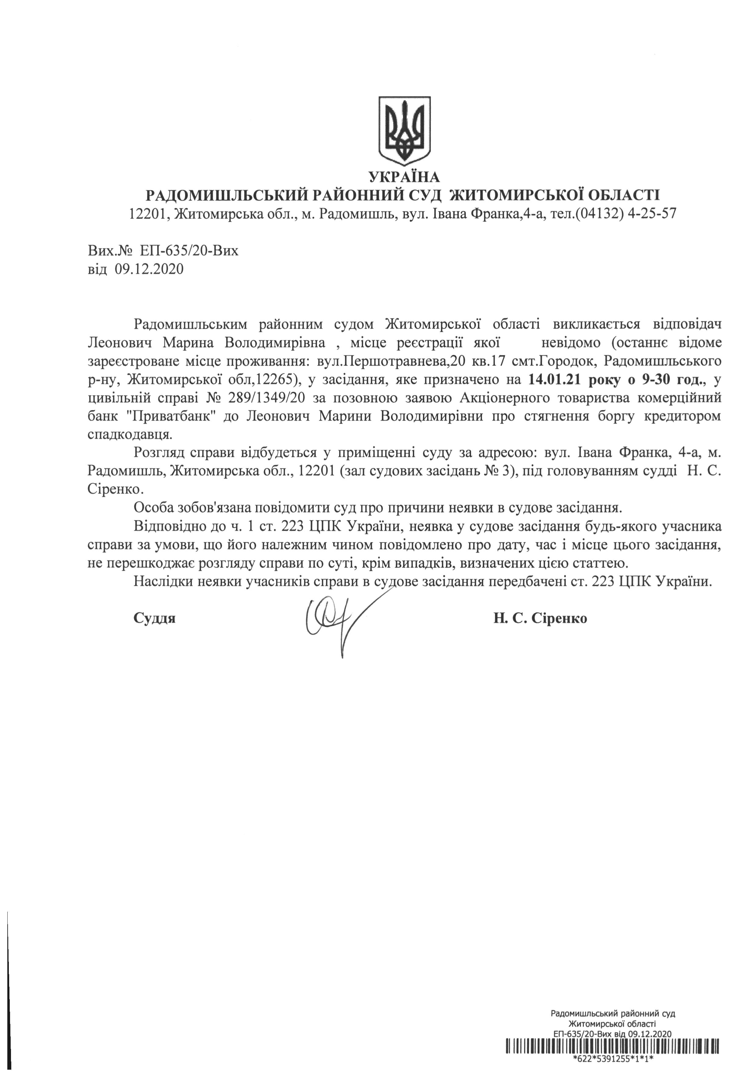 Оголошення про виклик до суду Леонович Марини Володимирівни у цивільній справі № 289/1349/20 за позовною заявою Акціонерного товариства комерційний банк "Приватбанк" до Леонович Марини Володимирівни про стягнення боргу кредитором спадкодавця