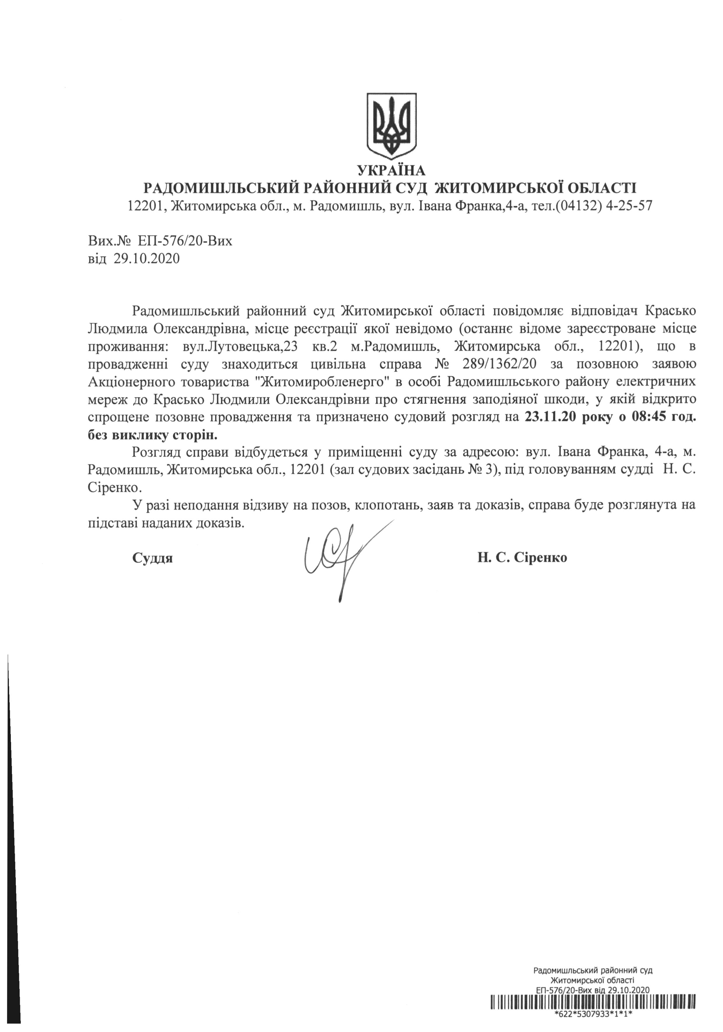 Радомишльський районний суд повідомляє Красько Людмилу Олександрівну про розгляд цивільної справи № 289/1362/20 за позовною заявою Акціонерного товариства "Житомиробленерго" в особі Радомишльського району електричних мереж до Красько Людмили Олександрівни про стягнення заподіяної шкоди