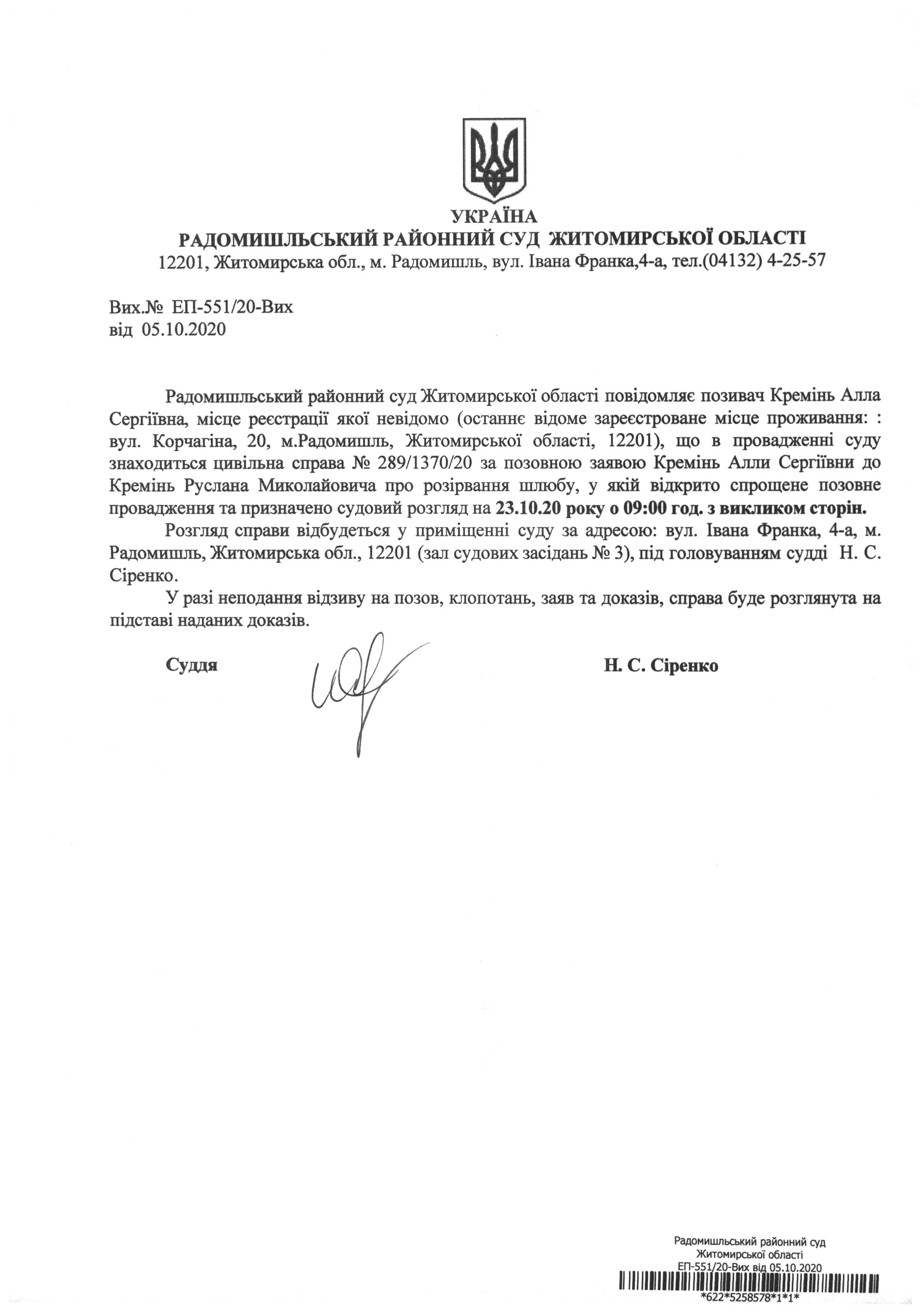 Радомишльський районний суд повідомляє Кремінь Аллу Сергіївну про розгляд цивільної справи № 289/1370/20 за позовною заявою Кремінь Алли Сергіївни до Кремінь Руслана Миколайовича про розірвання шлюбу