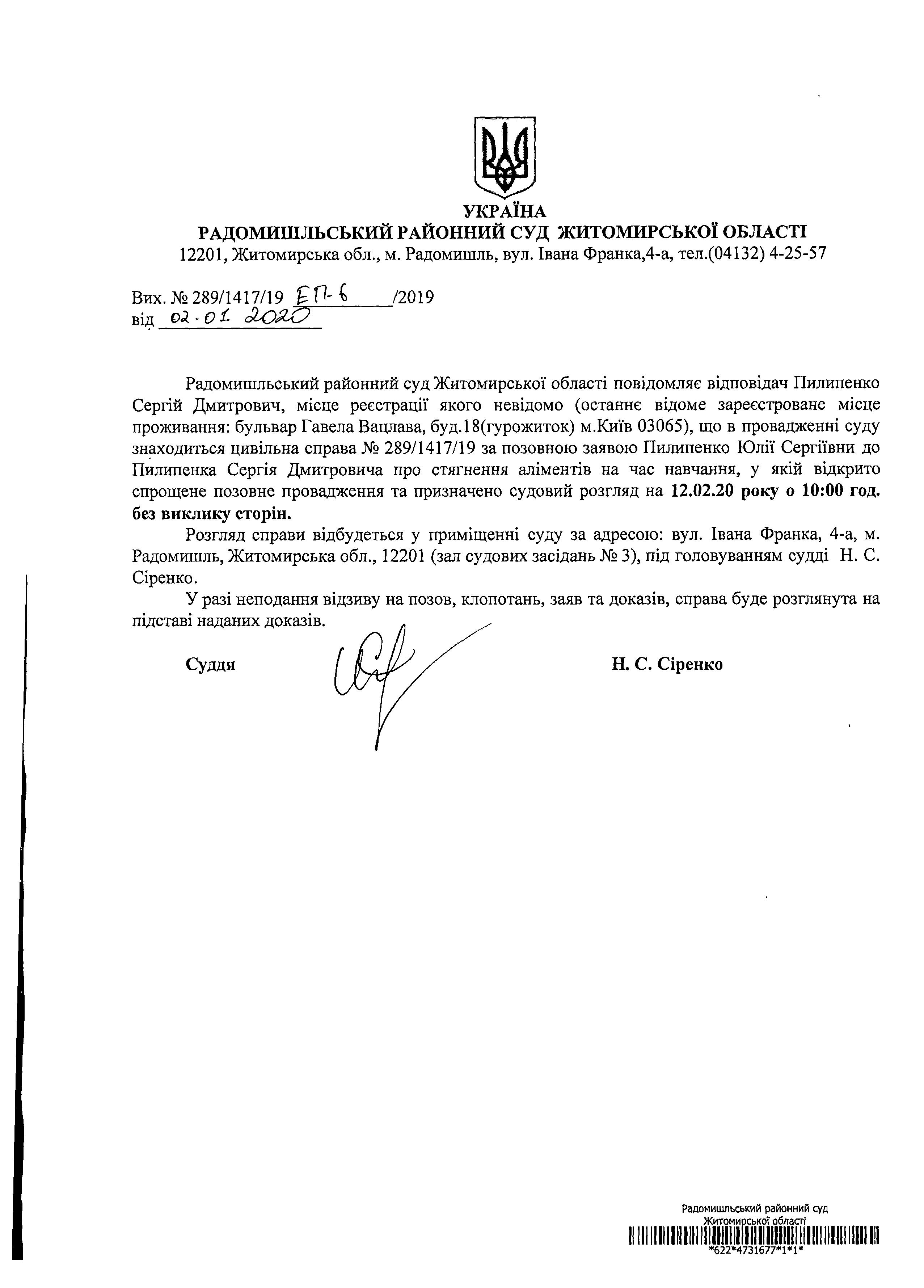 Оголошення про розгляд цивільної справи № 289/1417/19 за позовною заявою Пилипенко Юлії Сергіївни до Пилипенка Сергія Дмитровича про стягнення аліментів на час навчання