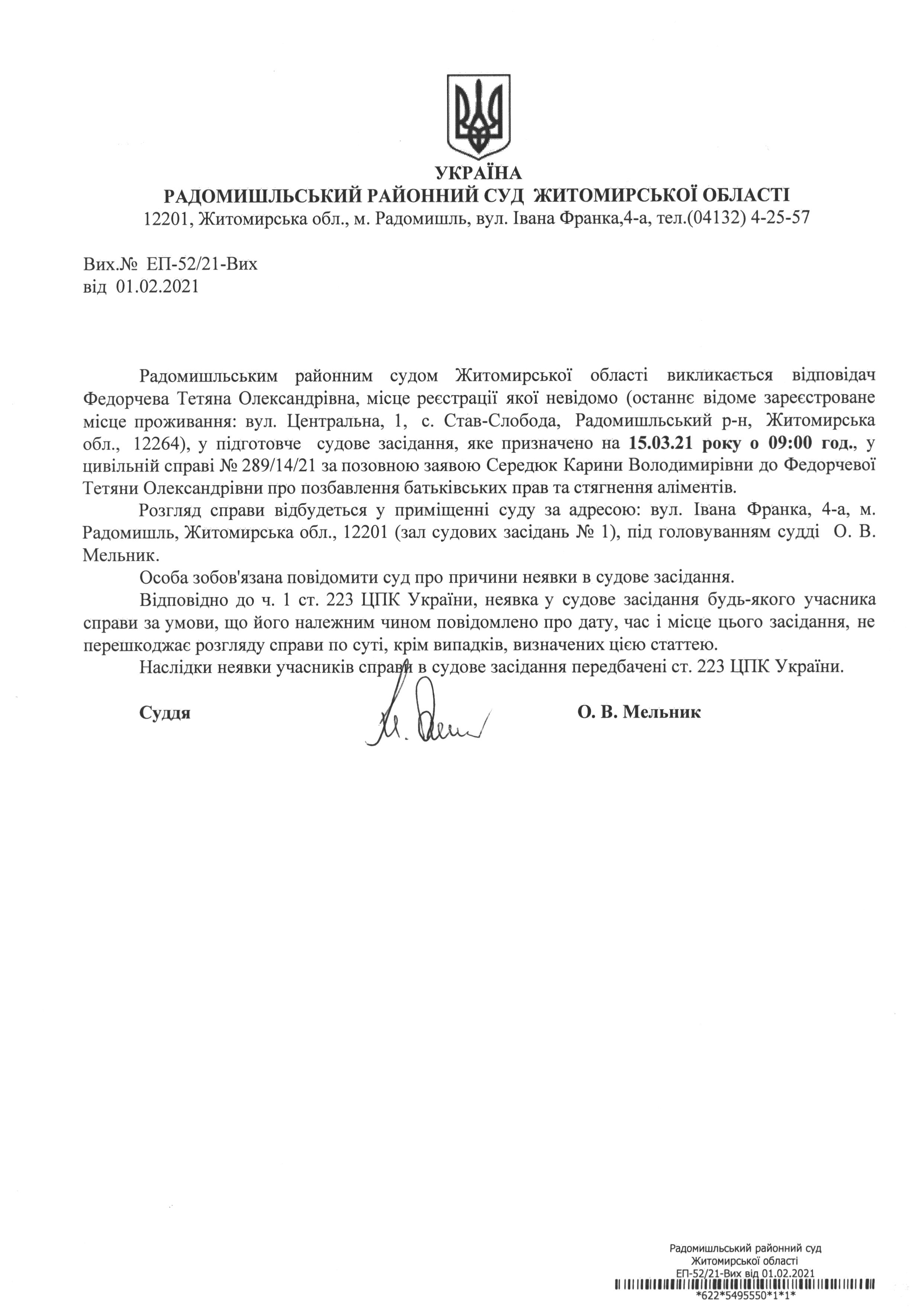 Оголошення про виклик до суду Федорчевої Тетяни Олександрівни у цивільній справі № 289/14/21 за позовною заявою Середюк Карини Володимирівни до Федорчевої Тетяни Олександрівни про позбавлення батьківських прав та стягнення аліментів