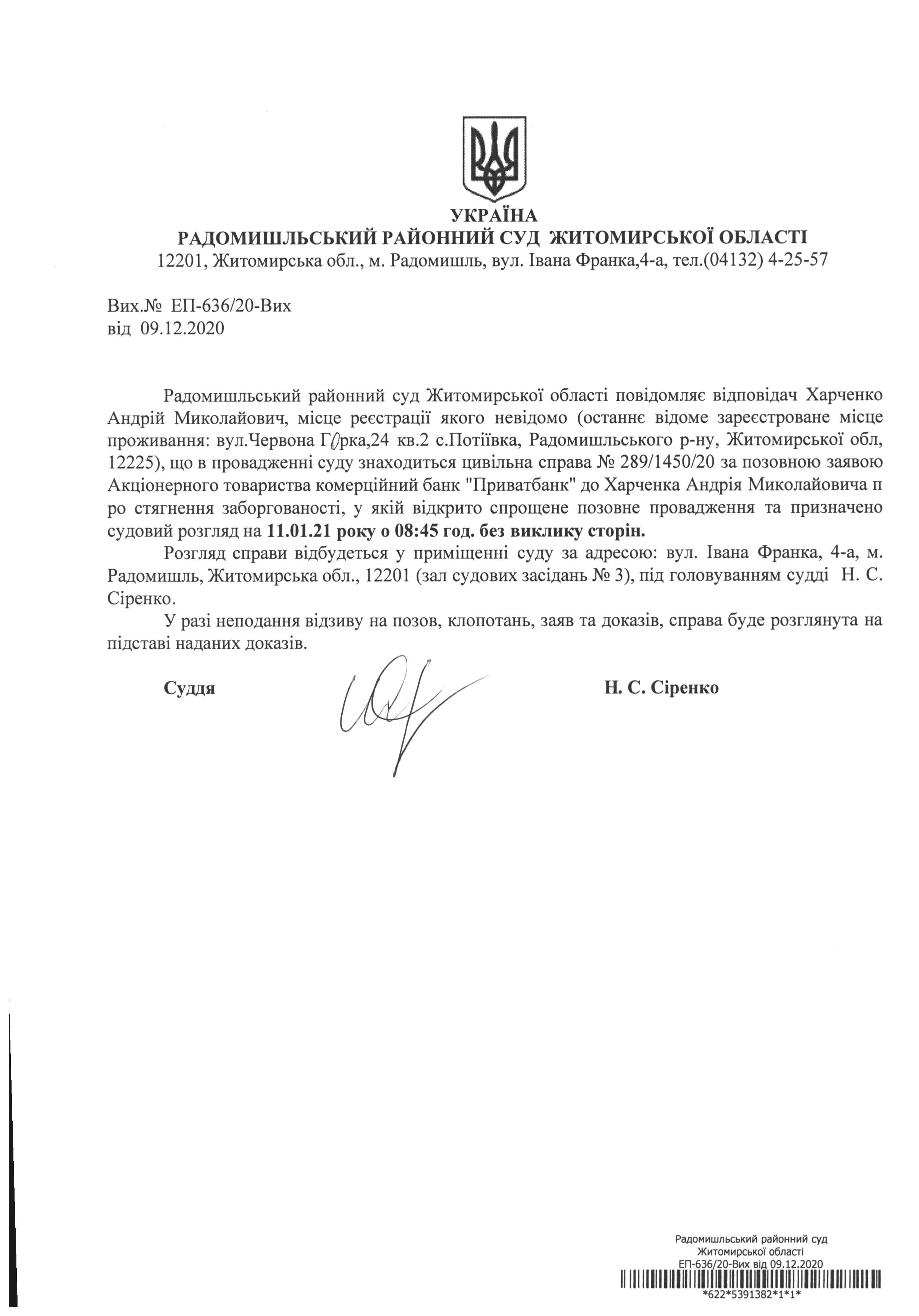 Радомишльський районний суд повідомляє Харченка Андрія Миколайовича про розгляд цивільної справи № 289/1450/20 за позовною заявою Акціонерного товариства комерційний банк "Приватбанк" до Харченка Андрія Миколайовича п ро стягнення заборгованості