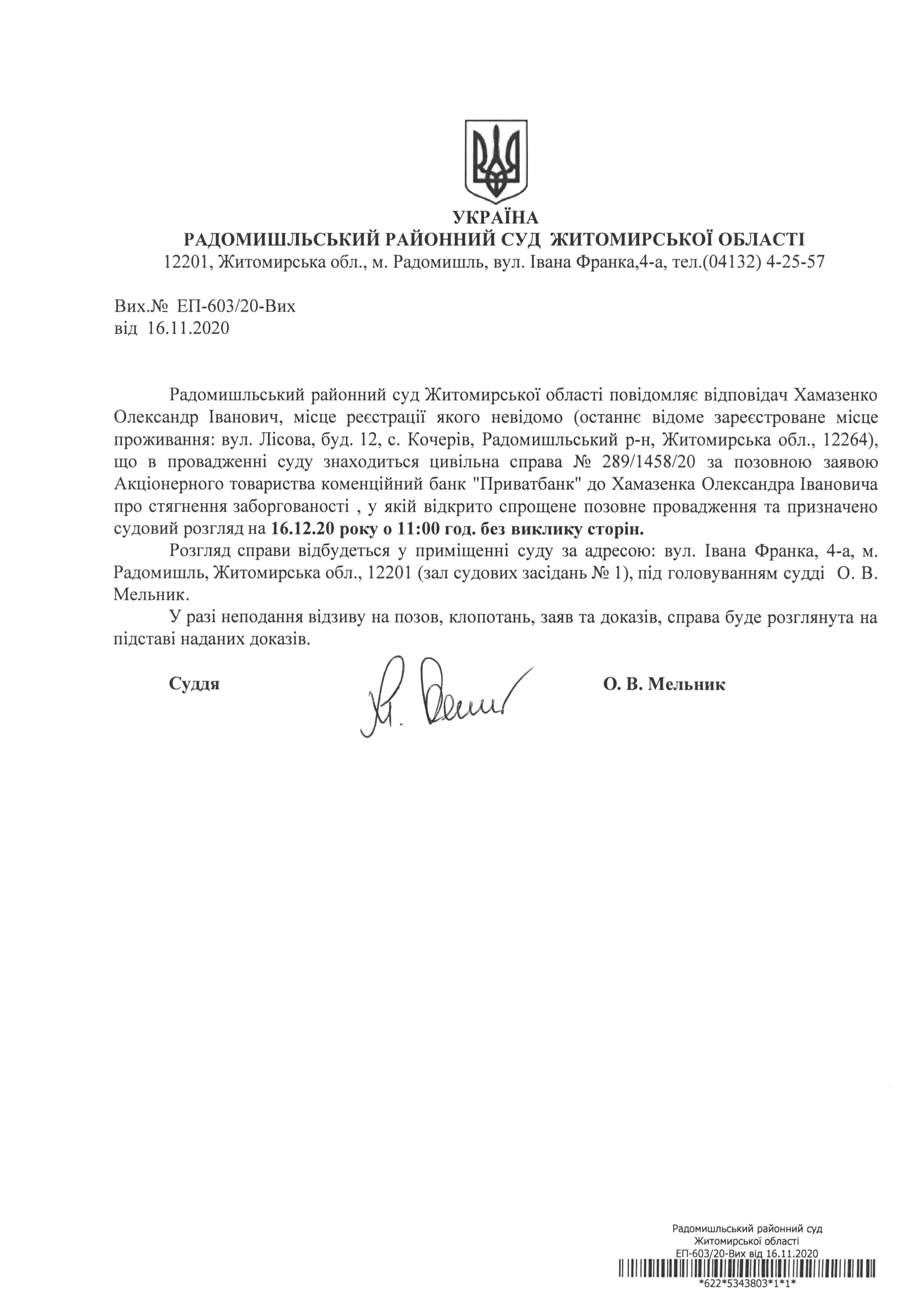 Радомишльський районний суд повідомляє Хамазенка Олександра Івановича про розгляд цивільної справи № 289/1458/20 за позовною заявою Акціонерного товариства коменційний банк "Приватбанк" до Хамазенка Олександра Івановича про стягнення заборгованості