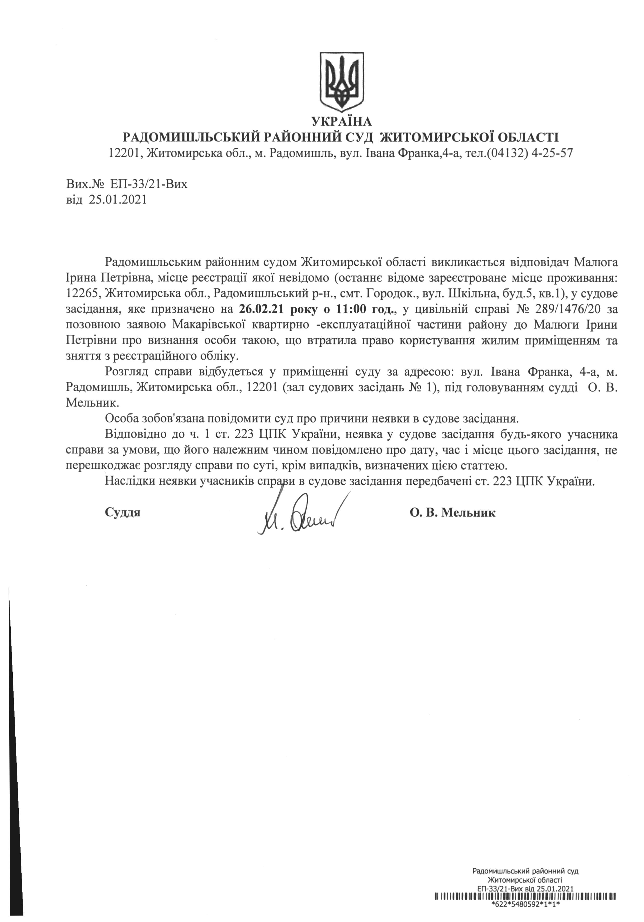 Оголошення про виклик до суду Фесай Малюги Ірини Петрівни у цивільній справі № 289/1476/20 за позовною заявою Макарівської квартирно -експлуатаційної частини району до Малюги Ірини Петрівни про визнання особи такою, що втратила право користування жилим приміщенням та зняття з реєстраційного обліку