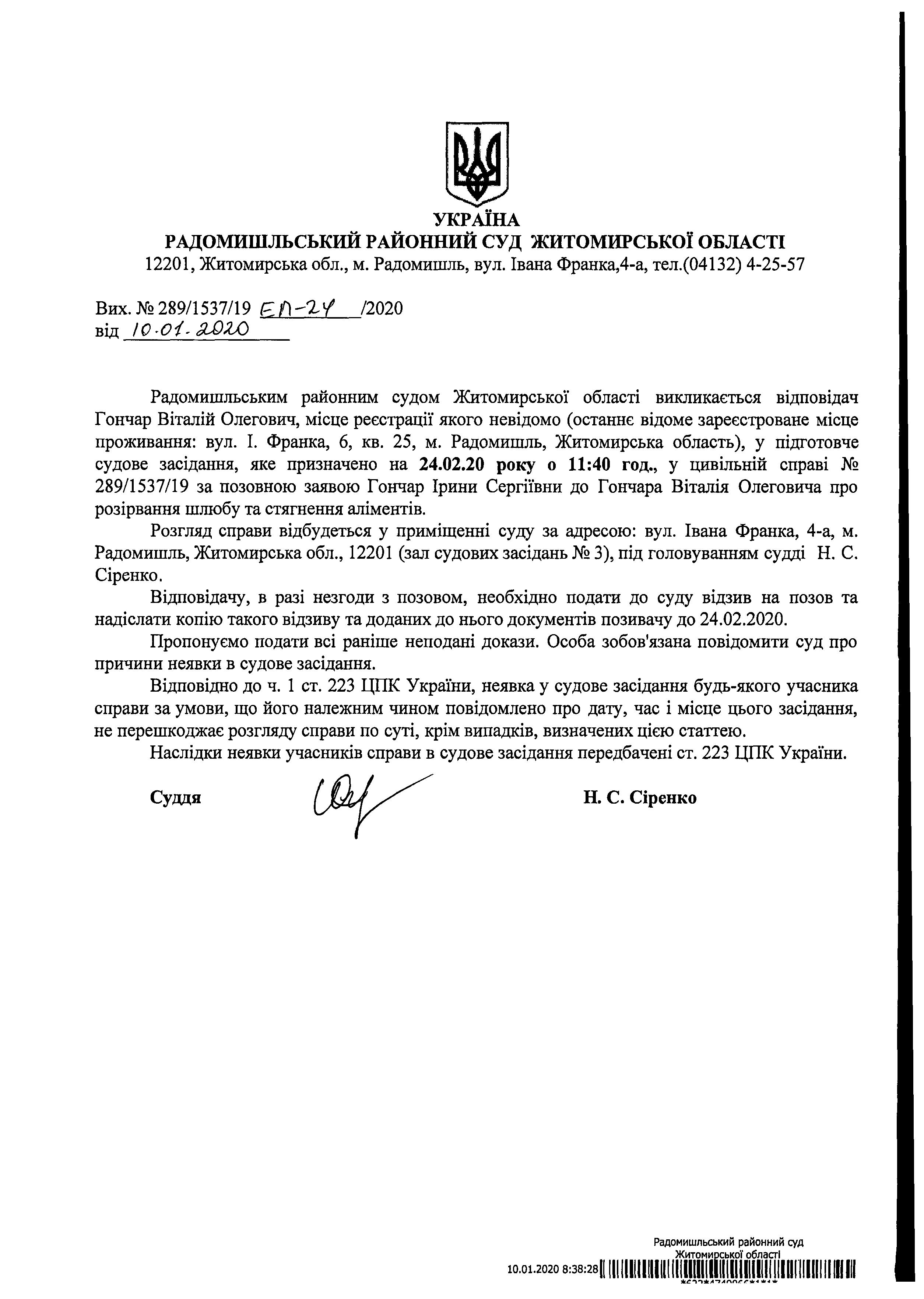 Оголошення про виклик до суду Гончара Віталія Олеговича у цивільній справі № 289/1537/19 за позовною заявою Гончар Ірини Сергіївни до Гончара Віталія Олеговича про розірвання шлюбу та стягнення аліментів
