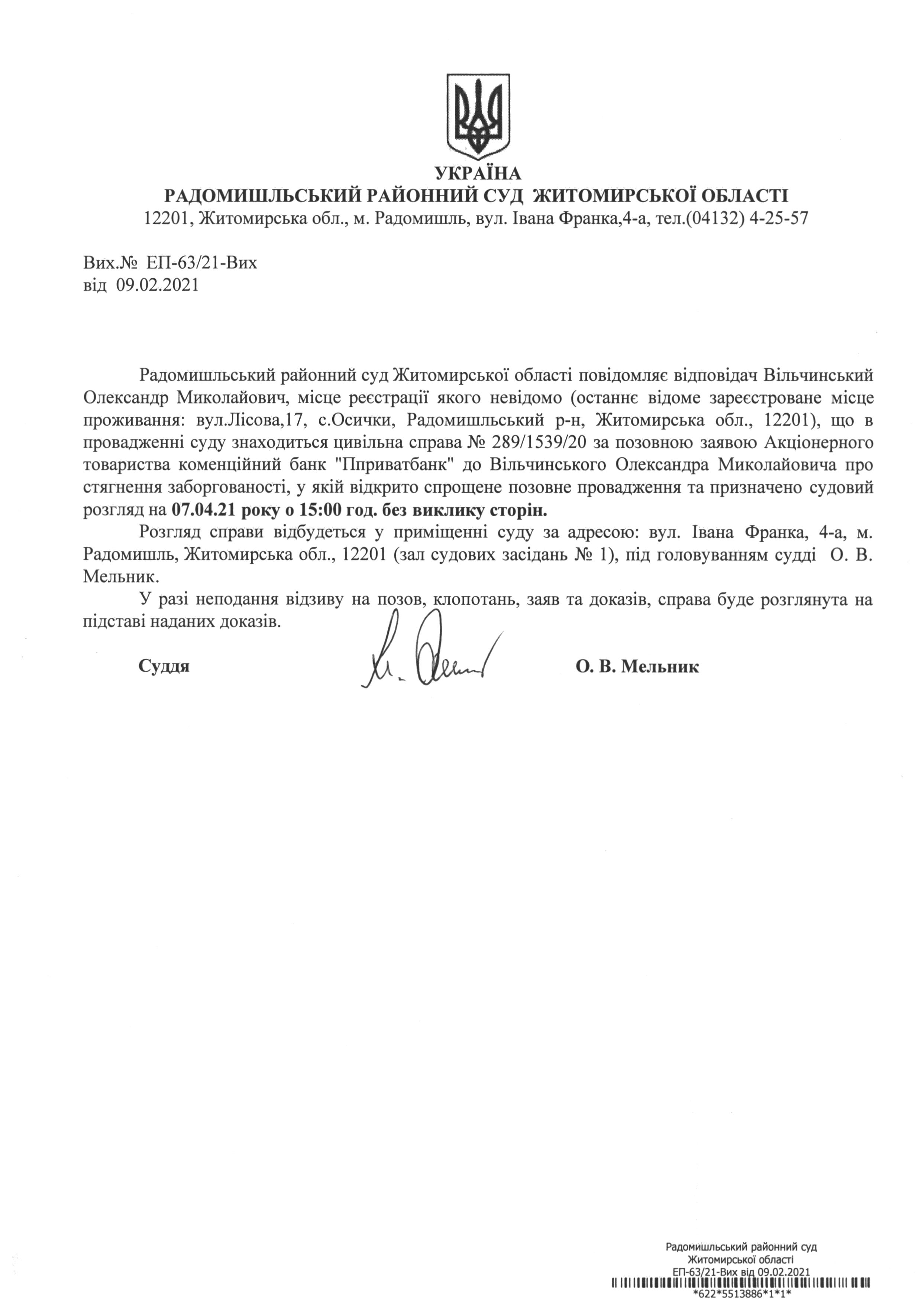 Радомишльський районний суд повідомляє Вільчинського Олександра Миколайовича про розгляд цивільної справи № 289/1539/20 за позовною заявою Акціонерного товариства коменційний банк "Пприватбанк" до Вільчинського Олександра Миколайовича про стягнення заборгованості