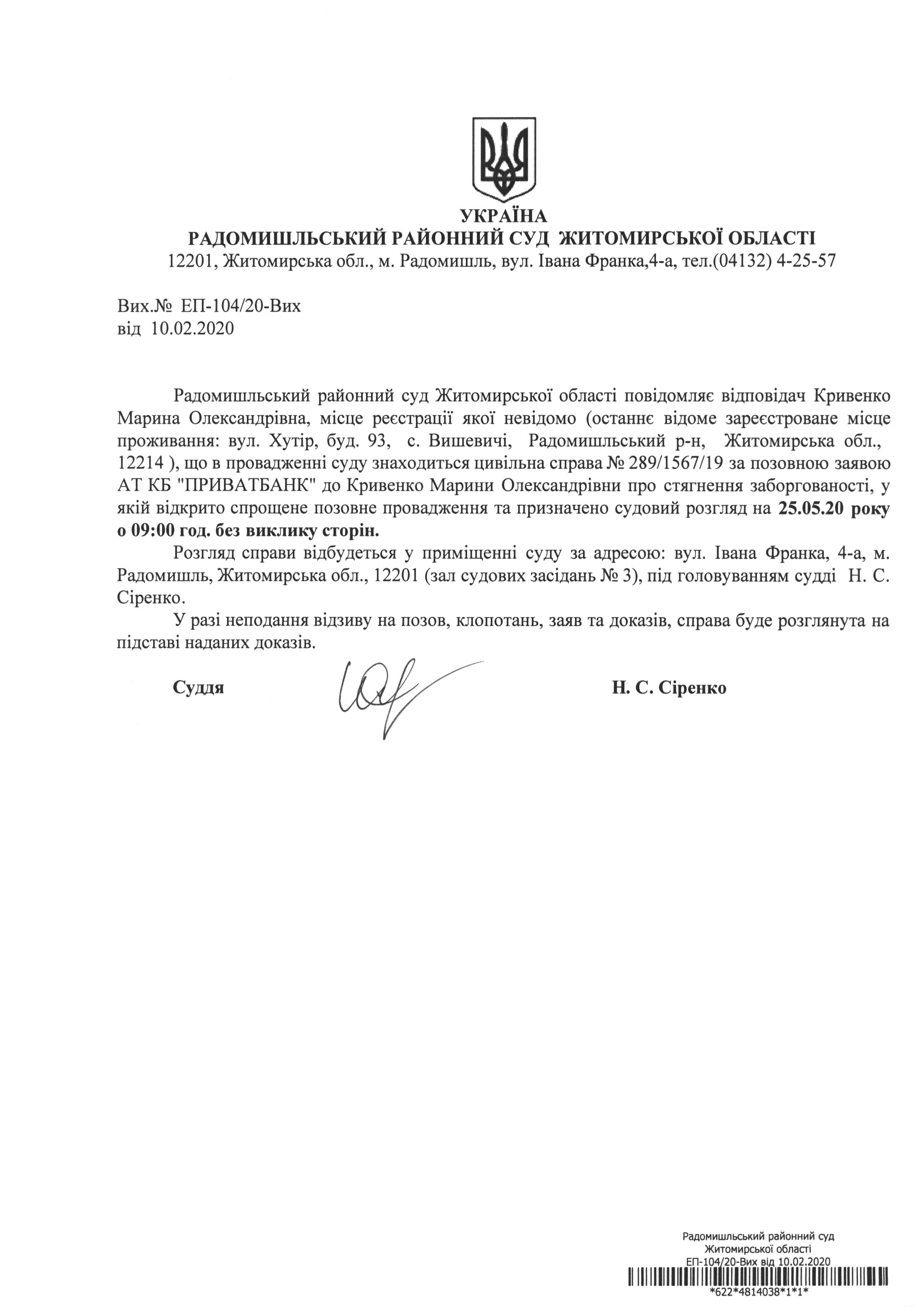 Оголошення про розгляд цивільної справи № 289/1567/19 за позовною заявою АТ КБ "ПРИВАТБАНК" до Кривенко Марини Олександрівни про стягнення заборгованості
