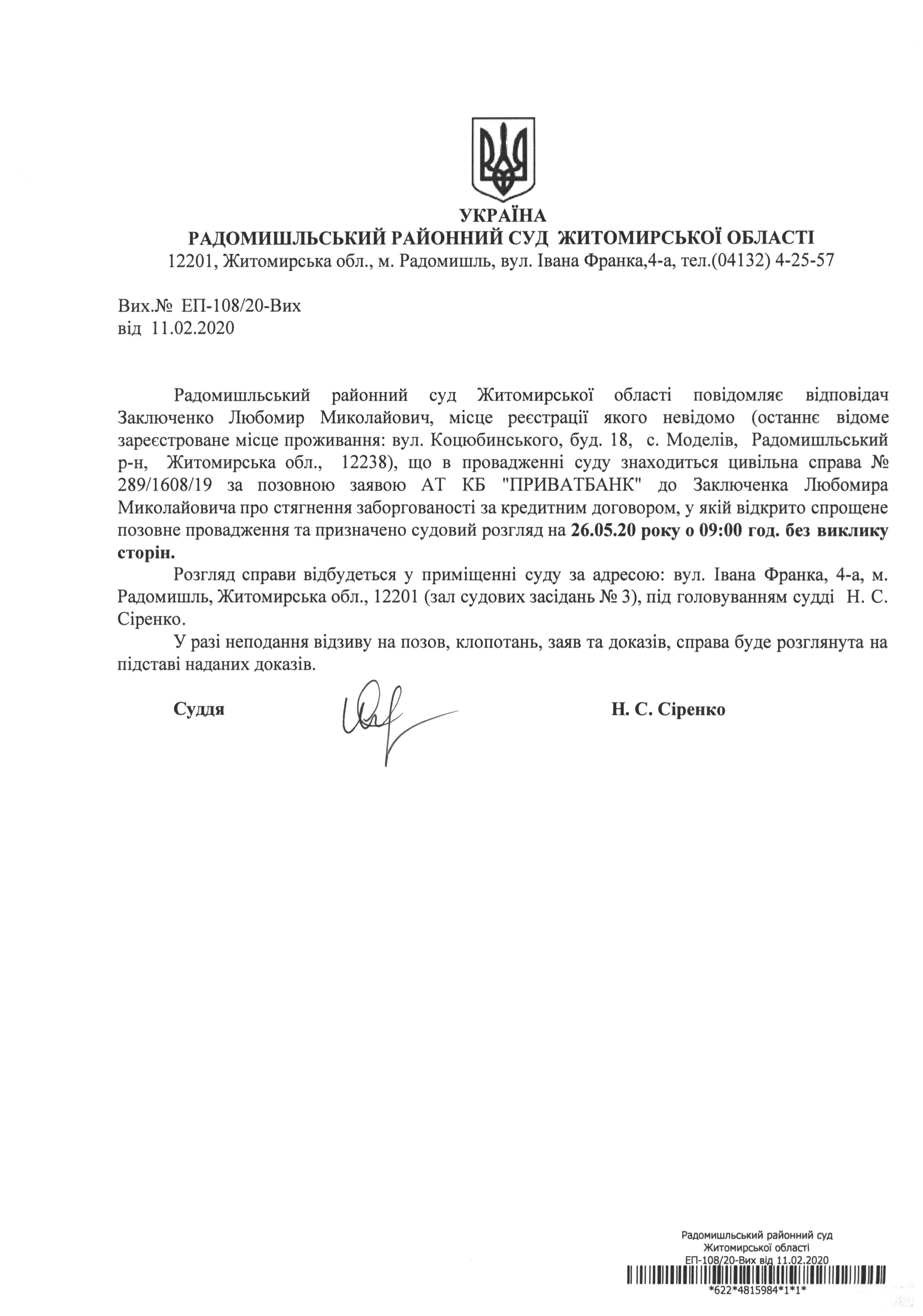 Оголошення про розгляд цивільної справи № 289/1608/19 за позовною заявою АТ КБ "ПРИВАТБАНК" до Заключенка Любомира Миколайовича про стягнення заборгованості за кредитним договором