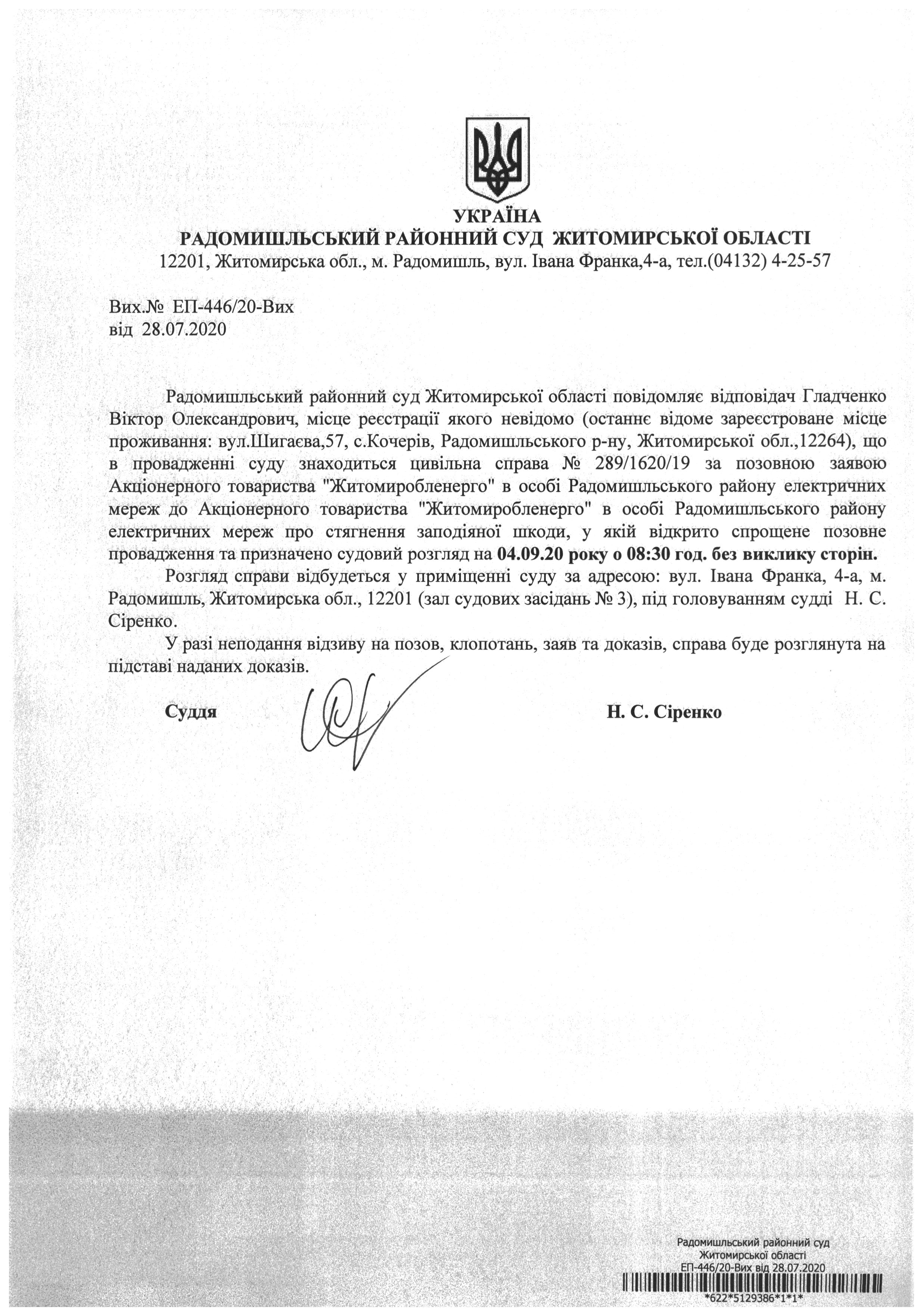 Радомишльський районний суд повідомляє Гладченка Віктора Олександровича про розгляд цивільної справи № 289/1620/19 за позовною заявою Акціонерного товариства "Житомиробленерго" в особі Радомишльського району електричних мереж до Акціонерного товариства "Житомиробленерго" в особі Радомишльського району електричних мереж про стягнення заподіяної шкоди