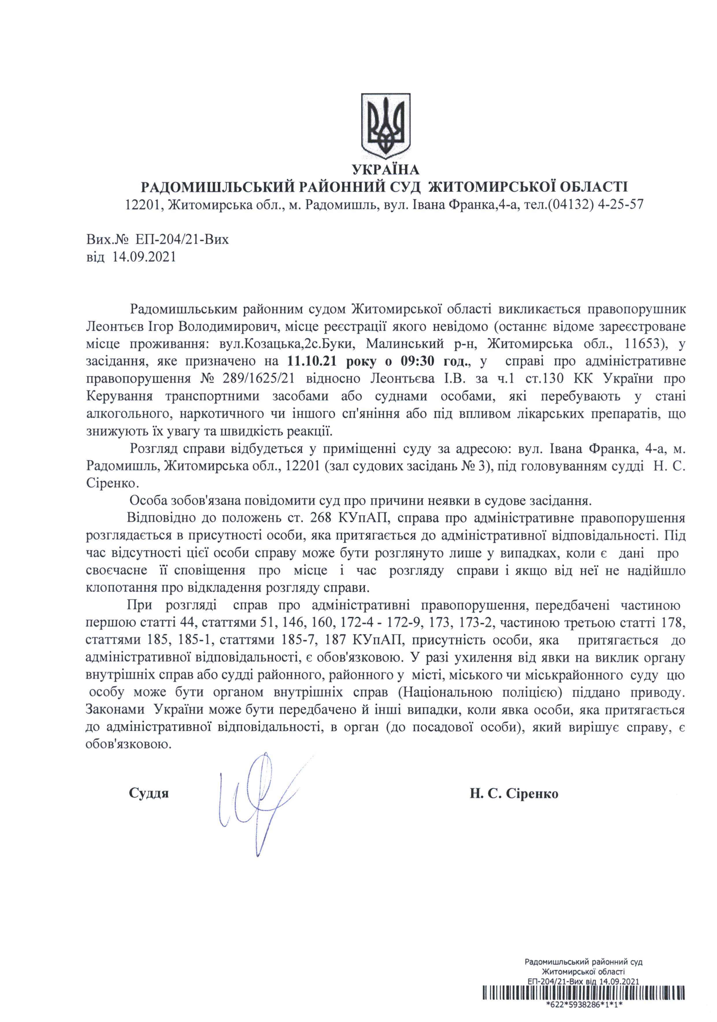Оголошення про виклик до суду Леонтьєва Ігора Володимировича у справі про адміністративне правопорушення № 289/1625/21 за ч.І ст.130 КК України про Керування транспортними засобами або суднами особами, які перебувають у стані алкогольного, наркотичного чи іншого сп'яніння або під впливом лікарських препаратів, що знижують їх увагу та швидкість реакції.