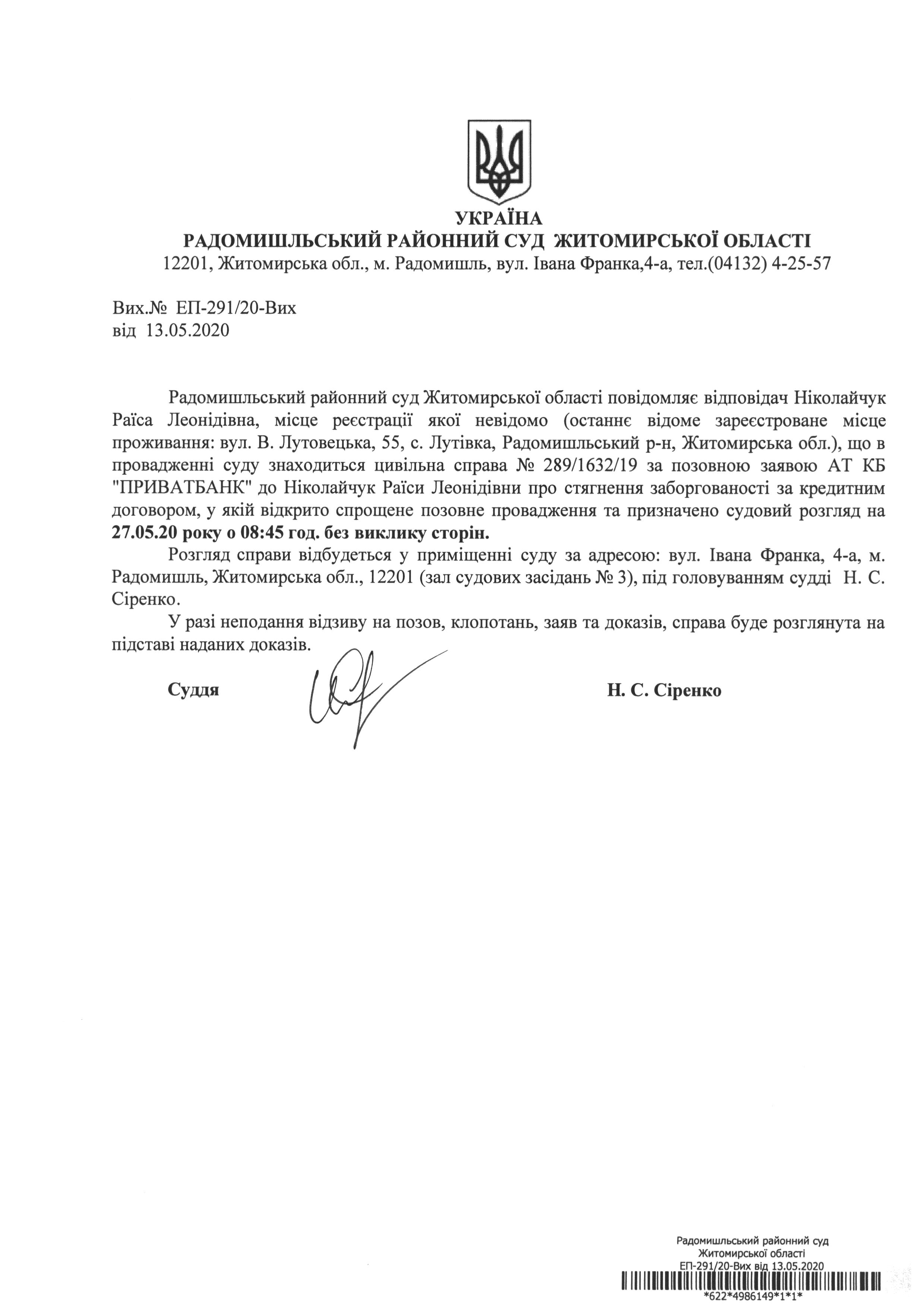 Оголошення про розгляд цивільної справи № 289/1632/19 за позовною заявою АТ КБ "ПРИВАТБАНК" до Ніколайчук Раїси Леонідівни про стягнення заборгованості за кредитним договором