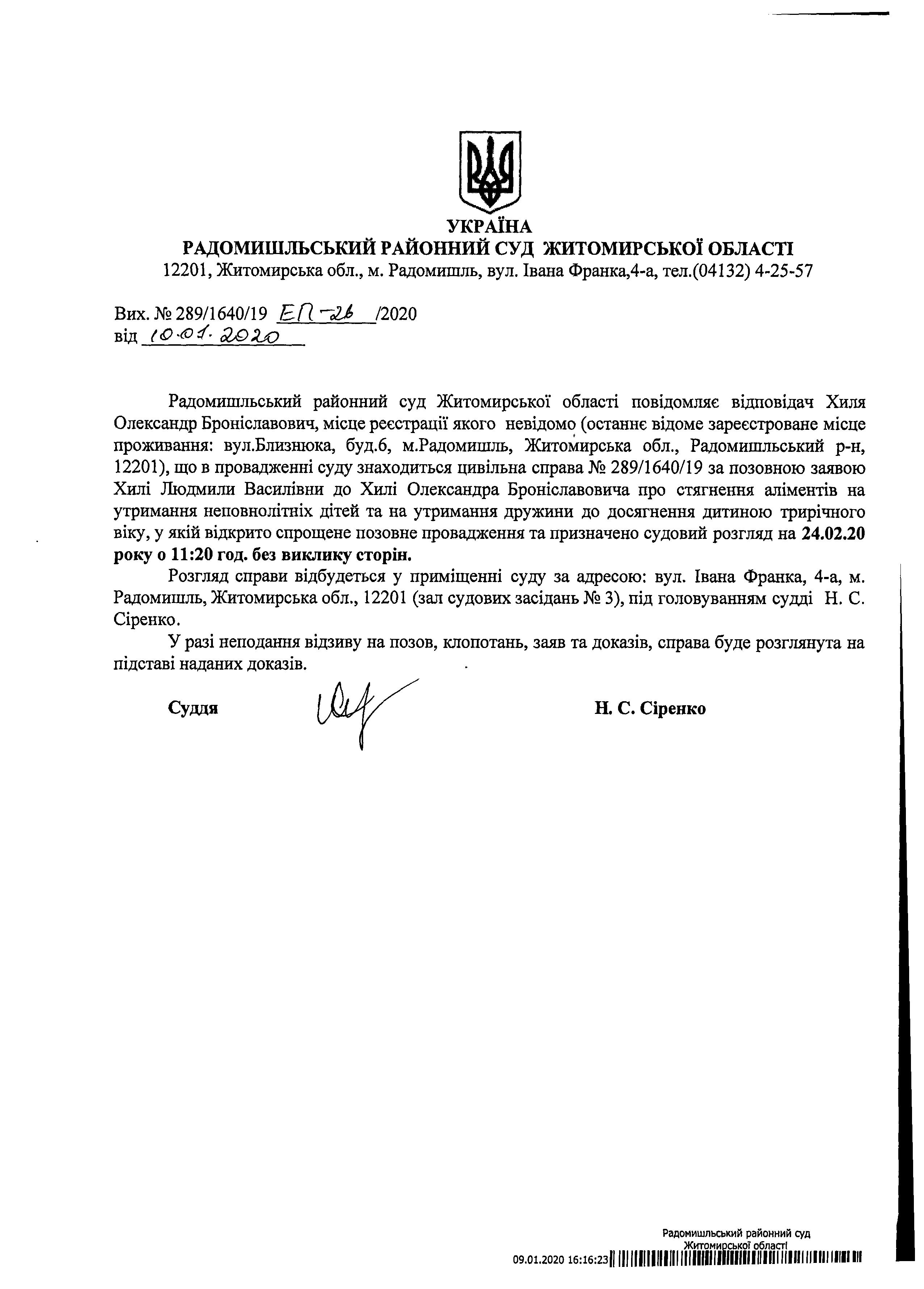Оголошення про розгляд цивільної справи № 289/1640/19 за позовною заявою Хилі Людмили Василівни до Хилі Олександра Броніславовича про стягнення аліментів на утримання неповнолітніх дітей та на утримання дружини до досягнення дитиною трирічного віку