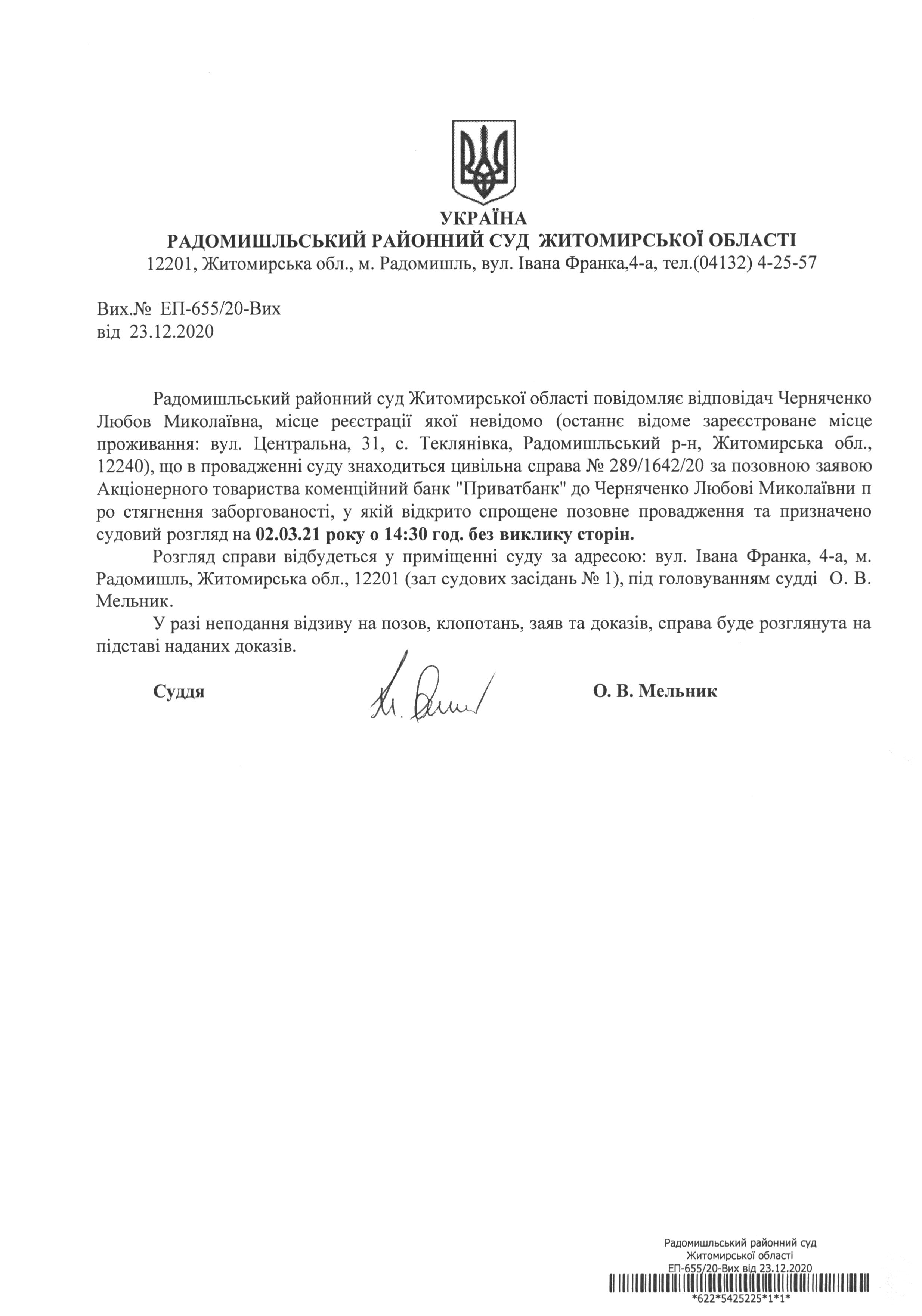Радомишльський районний суд повідомляє Черняченко Любов Миколаївну про розгляд цивільної справи № 289/1642/20 за позовною заявою Акціонерного товариства коменційний банк "Приватбанк" до Черняченко Любові Миколаївни п ро стягнення заборгованості