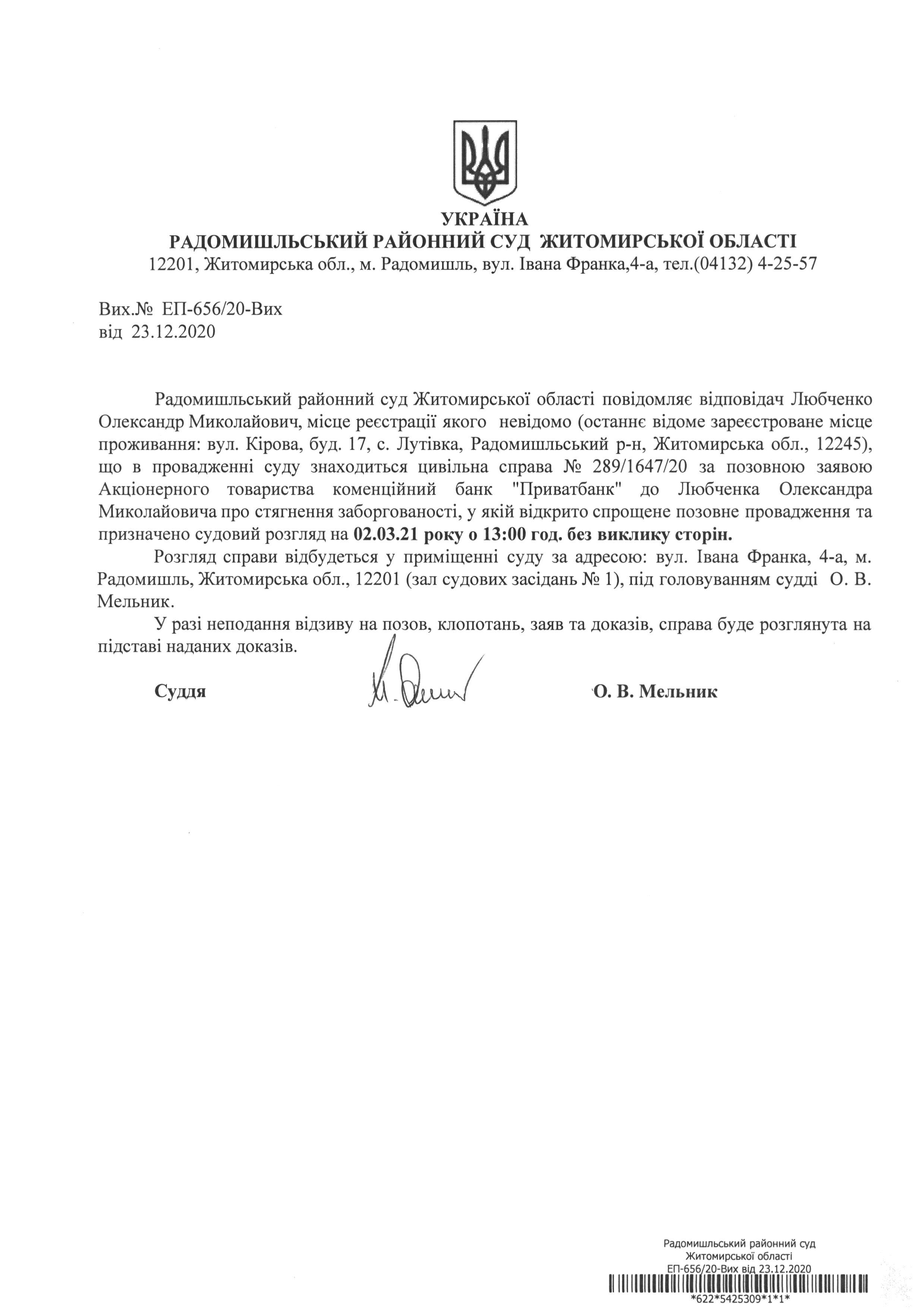 Радомишльський районний суд повідомляє Любченка Олександра Миколайовича про розгляд цивільної справи № 289/1647/20 за позовною заявою Акціонерного товариства коменційний банк "Приватбанк" до Любченка Олександра Миколайовича про стягнення заборгованості