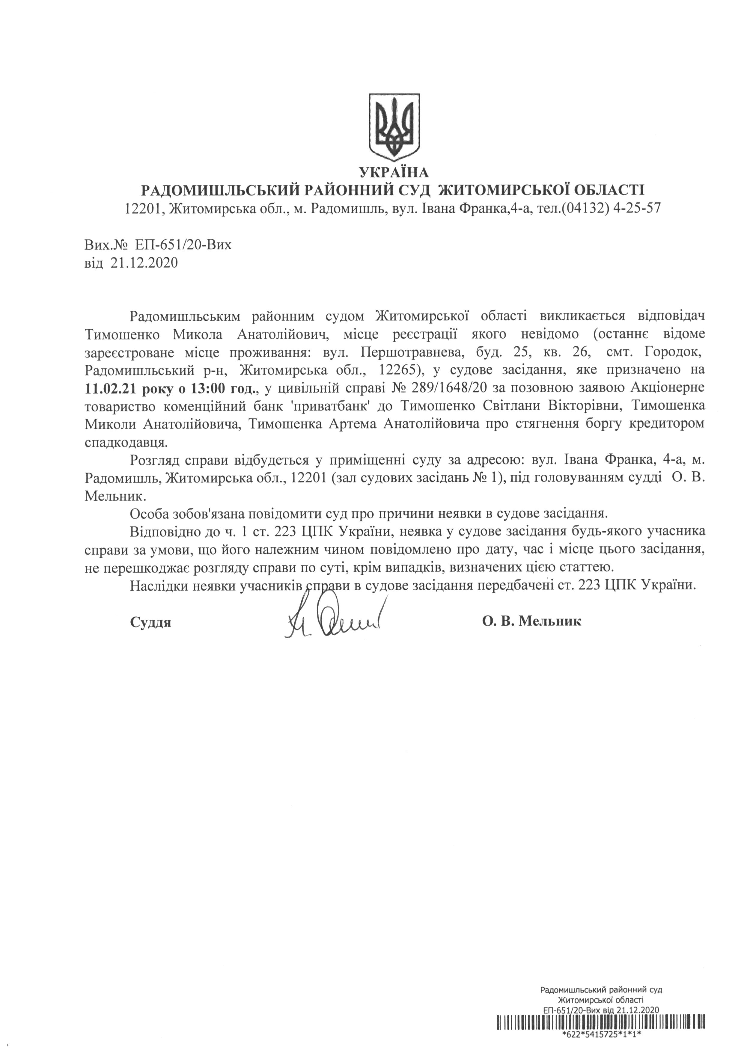 Оголошення про виклик до суду Тимошенка Миколи Анатолійовича у цивільній справі №289/1648/20 за позовною заявою Акціонерне товариство коменційний банк 'приватбанк' до Тимошенко Світлани Вікторівни, Тимошенка Миколи Анатолійовича, Тимошенка Артема Анатолійовича про стягнення боргу кредитором спадкодавця
