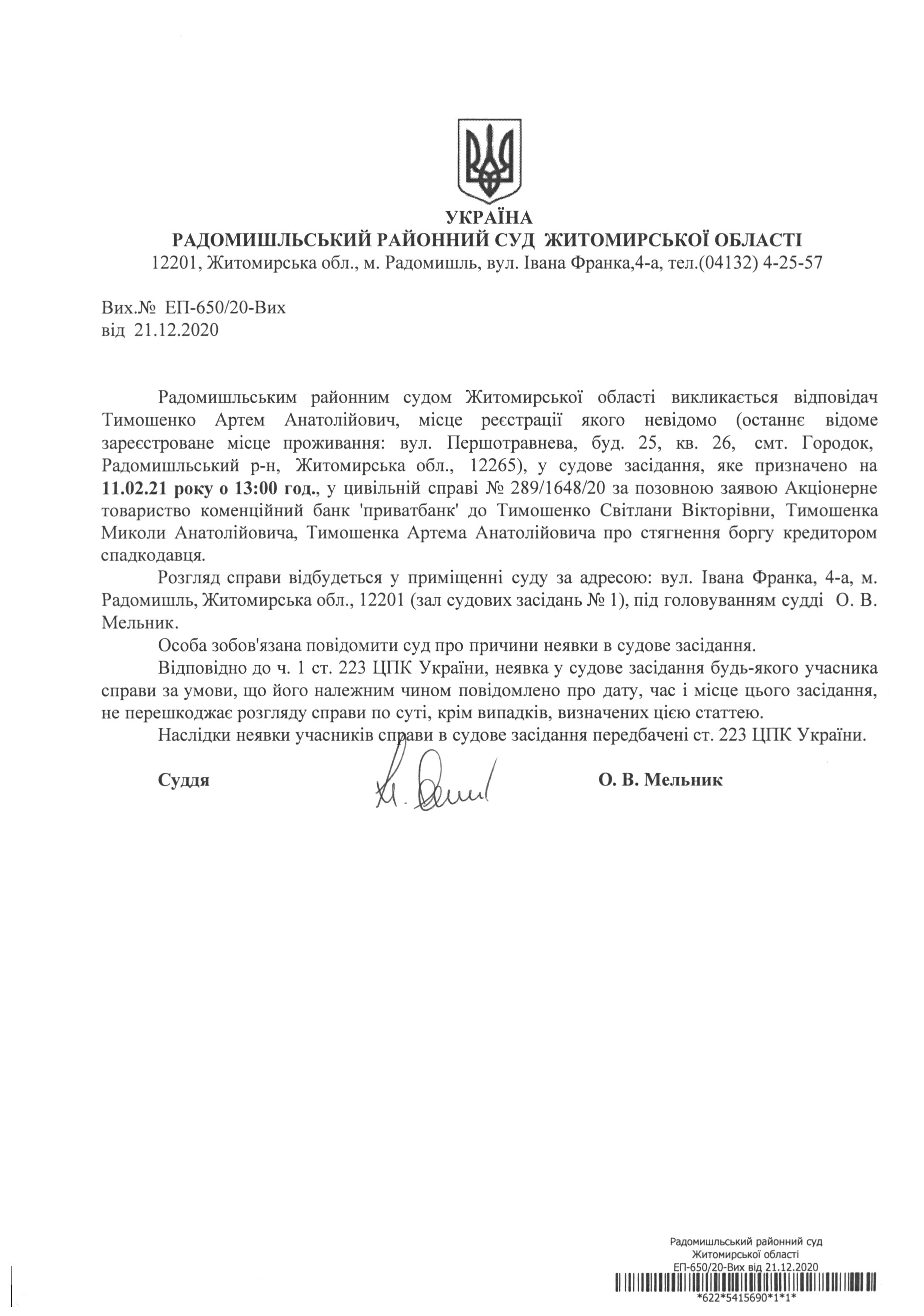 Оголошення про виклик до суду Тимошенка Артема Анатолійовича у цивільній справі № 289/1648/20 за позовною заявою Акціонерне товариство коменційний банк 'приватбанк' до Тимошенко Світлани Вікторівни, Тимошенка Миколи Анатолійовича, Тимошенка Артема Анатолійовича про стягнення боргу кредитором спадкодавця