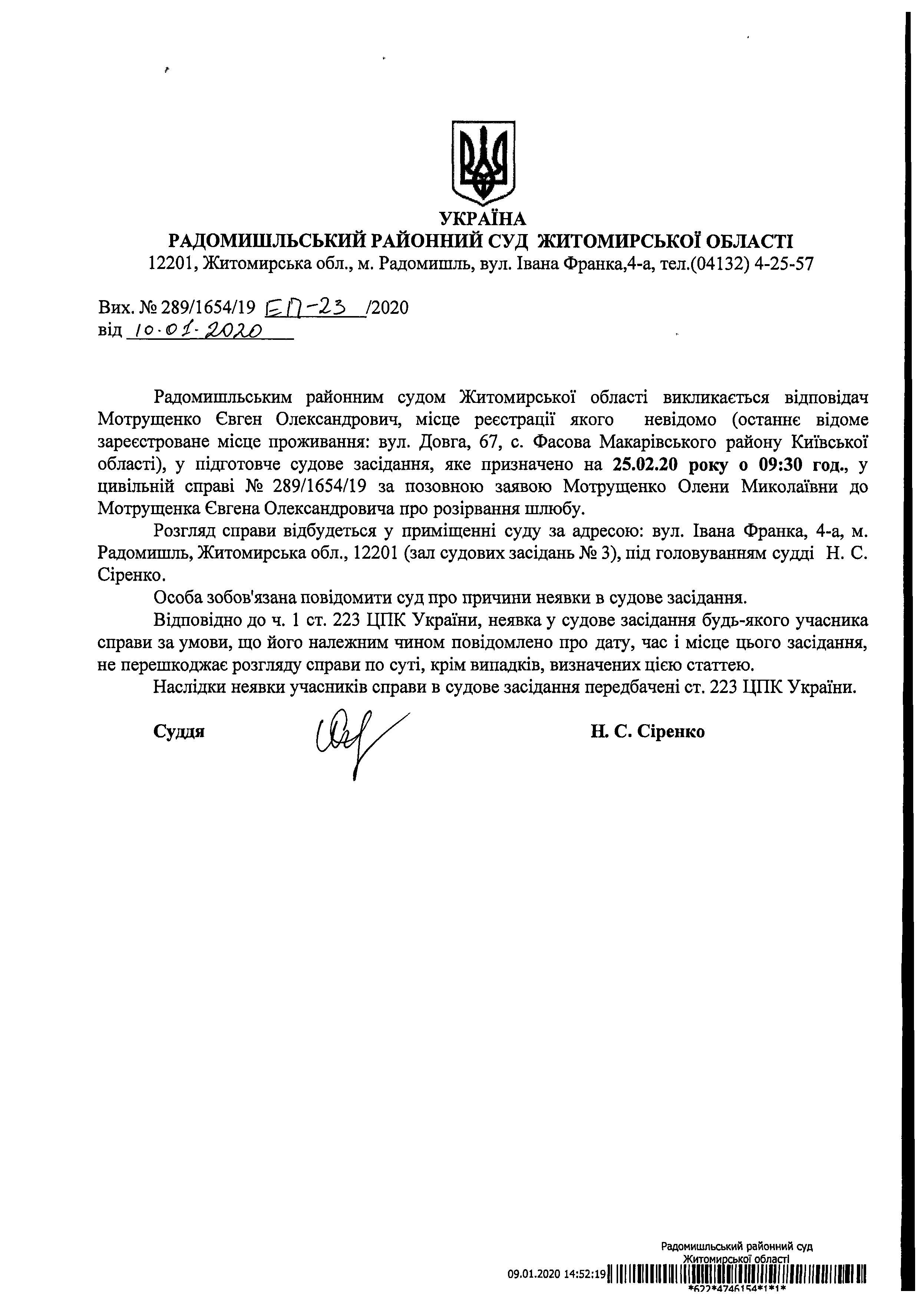 Оголошення про виклик до суду Мотрущенка Євгена Олександровича у цивільній справі № 289/1654/19 за позовною заявою Мотрущенко Олени Миколаївни до Мотрущенка Євгена Олександровича про розірвання шлюбу