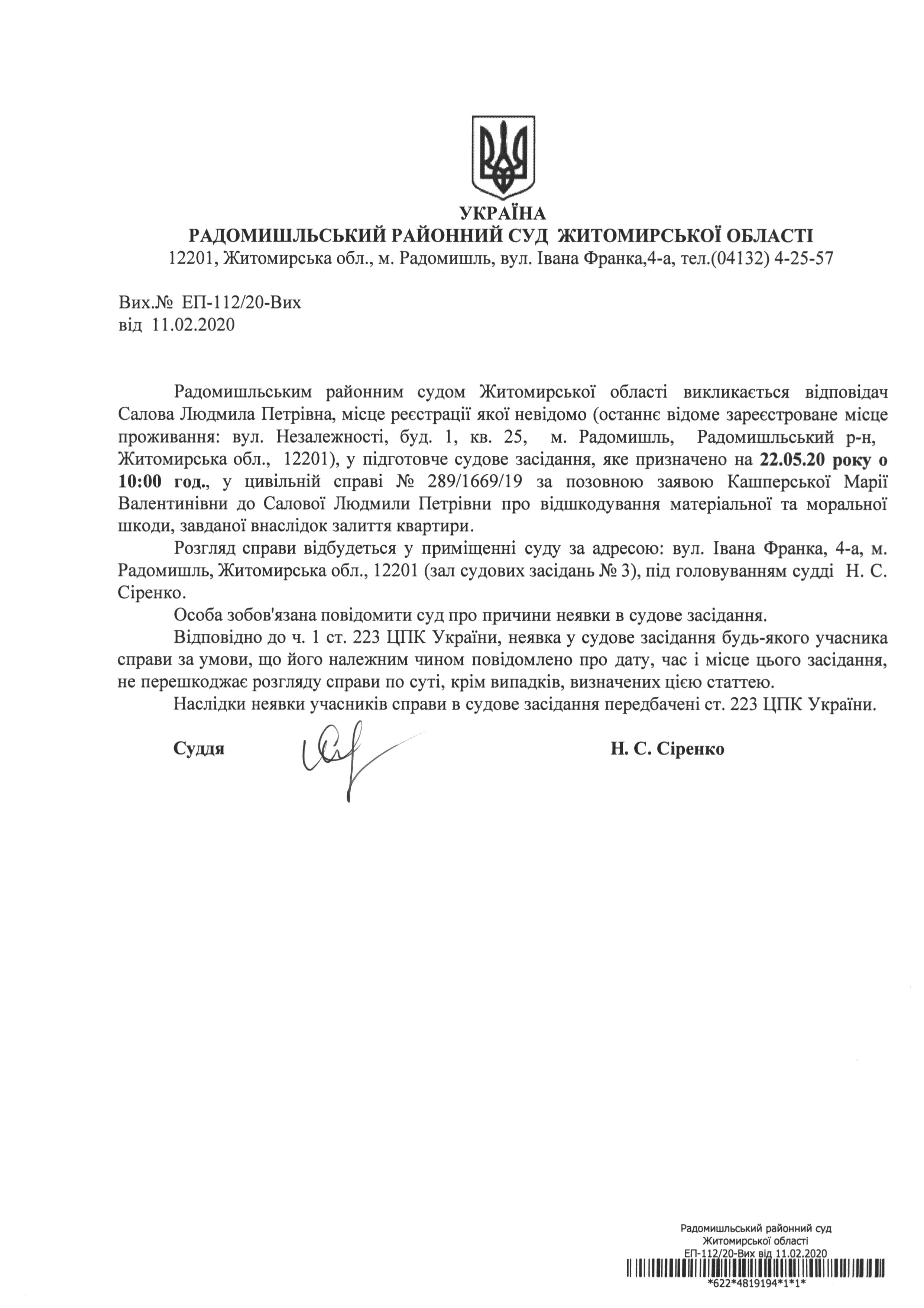 Оголошення про виклик до суду Салової Людмили Петрівни у цивільній справі № 289/1669/19 за позовною заявою Кашперської Марії Валентинівни до Салової Людмили Петрівни про відшкодування матеріальної та моральної шкоди, завданої внаслідок залиття квартири.
