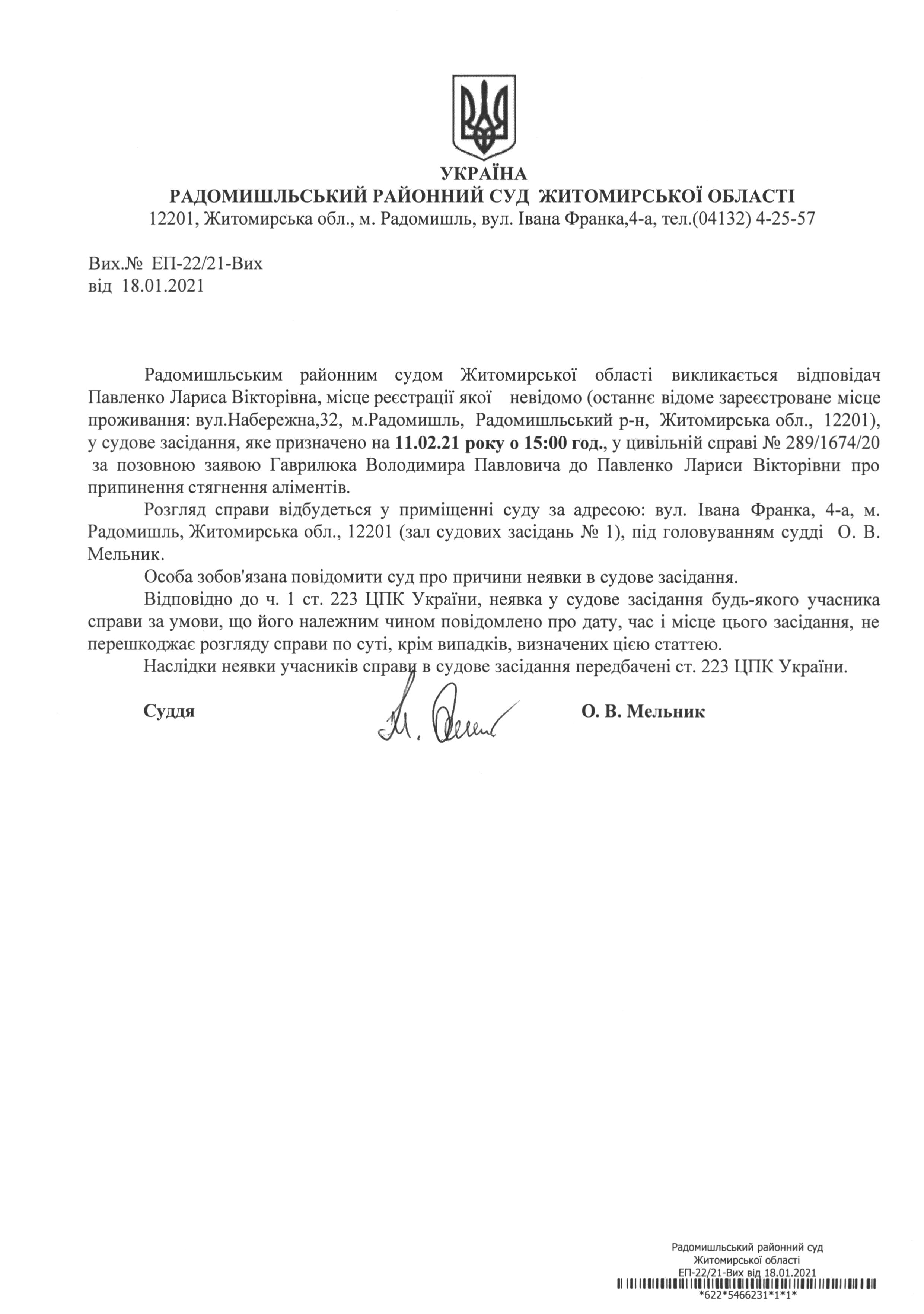 Оголошення про виклик до суду Павленко Лариси Вікторівни у цивільній справі № 289/1674/20 за позовною заявою Гаврилюка Володимира Павловича до Павленко Лариси Вікторівни про припинення стягнення аліментів