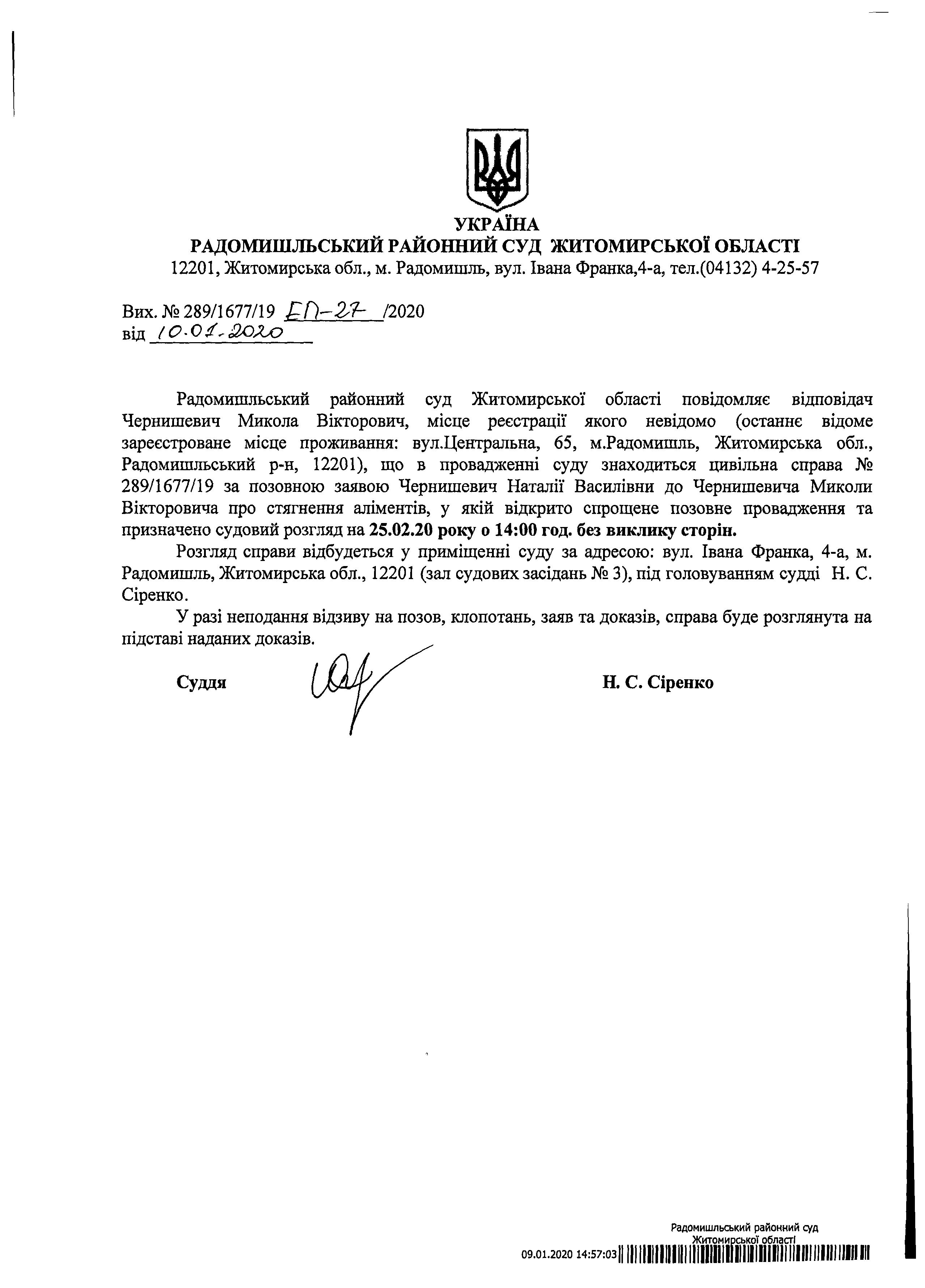 Оголошення про розгляд цивільної справи № 289/1677/19 за позовною заявою Чернишевич Наталії Василівни до Чернишевича Миколи Вікторовича про стягнення аліментів,