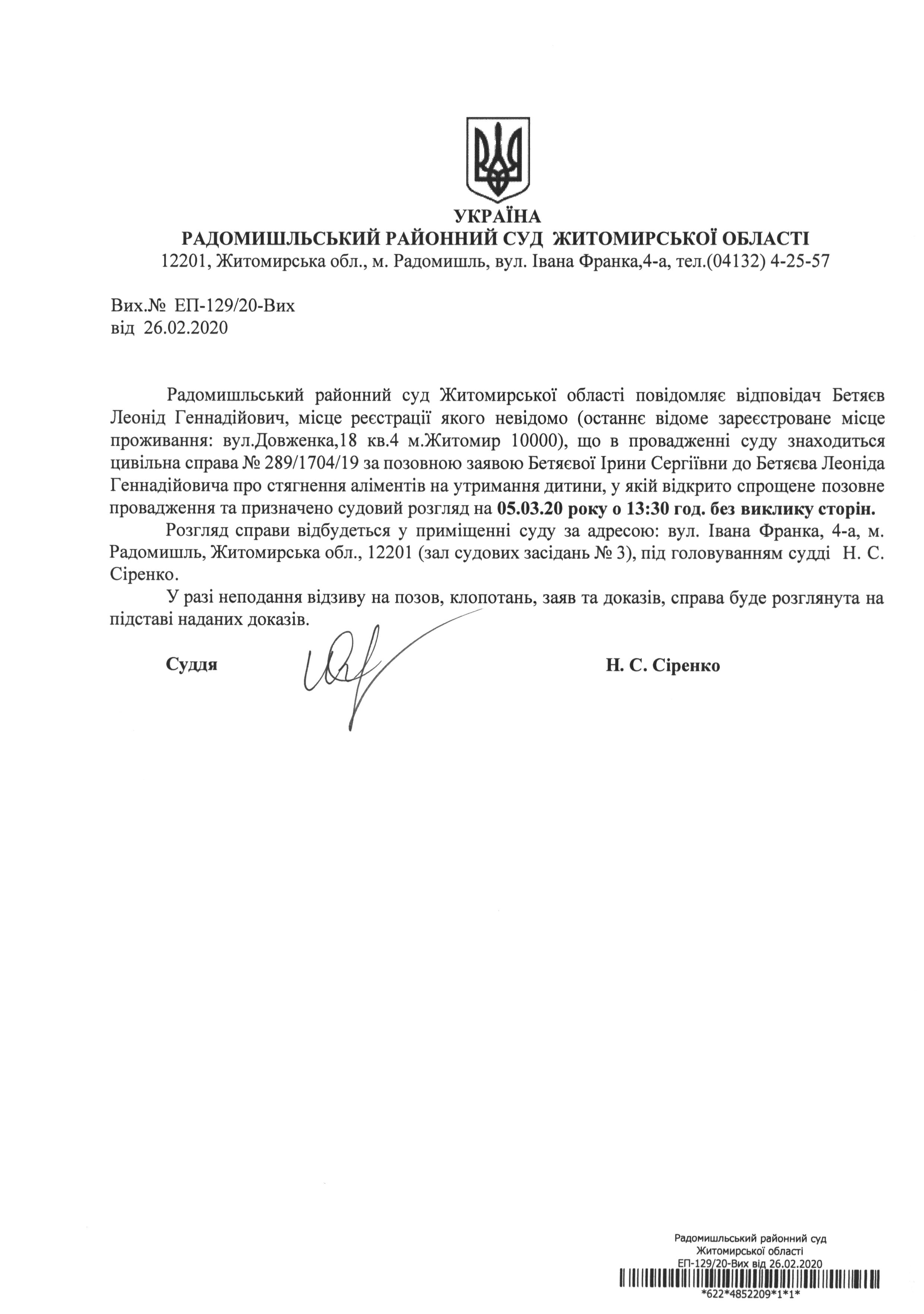 Оголошення про розгляд цивільної справи № 289/1704/19 за позовною заявою Бетяєвої Ірини Сергіївни до Бетяєва Леоніда Геннадійовича про стягнення аліментів на утримання дитини
