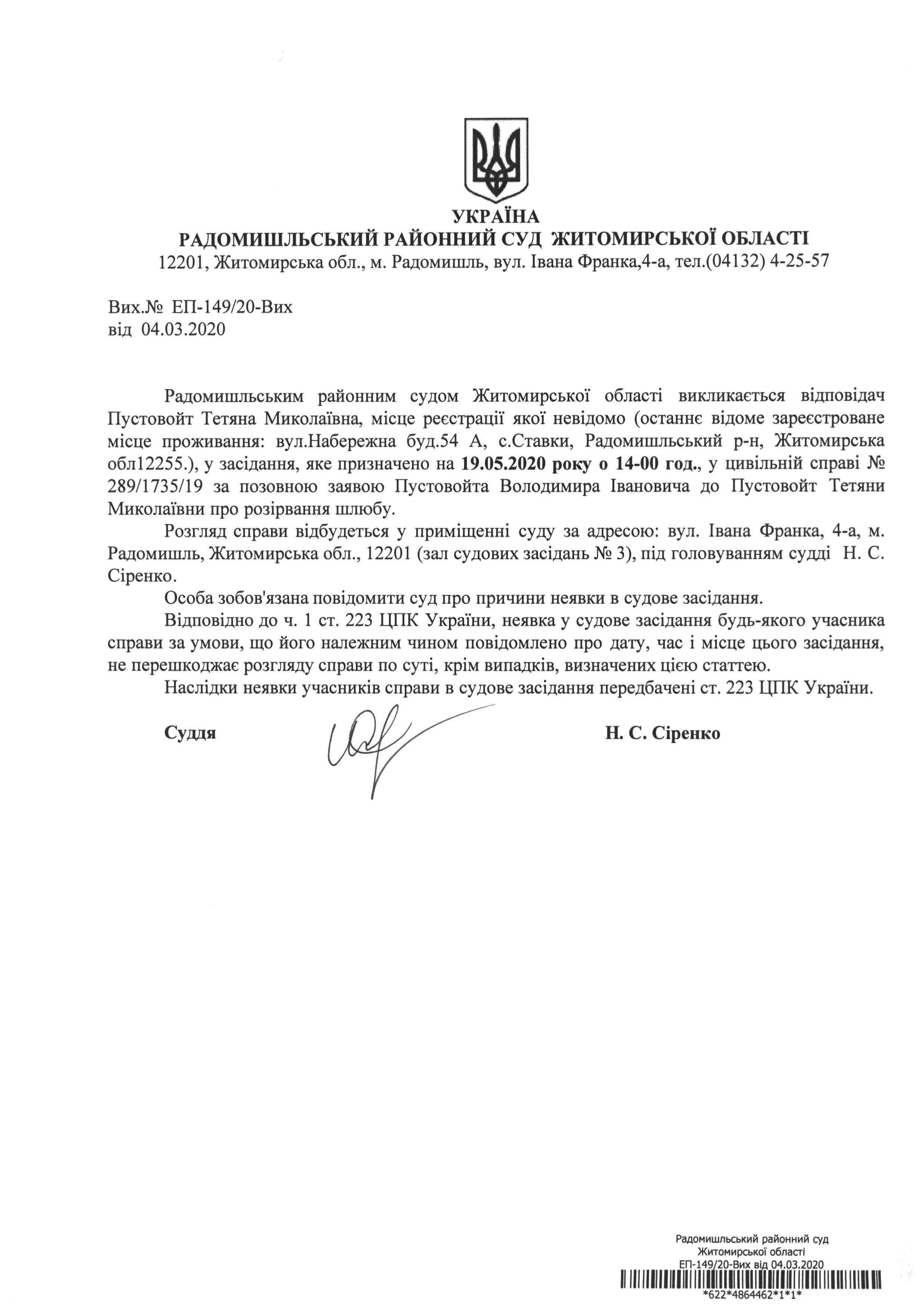 Оголошення про виклик до суду Пустовойт Тетяни Миколаївни у цивільній справі № 289/1735/19 за позовною заявою Пустовойта Володимира Івановича до Пустовойт Тетяни Миколаївни про розірвання шлюбу