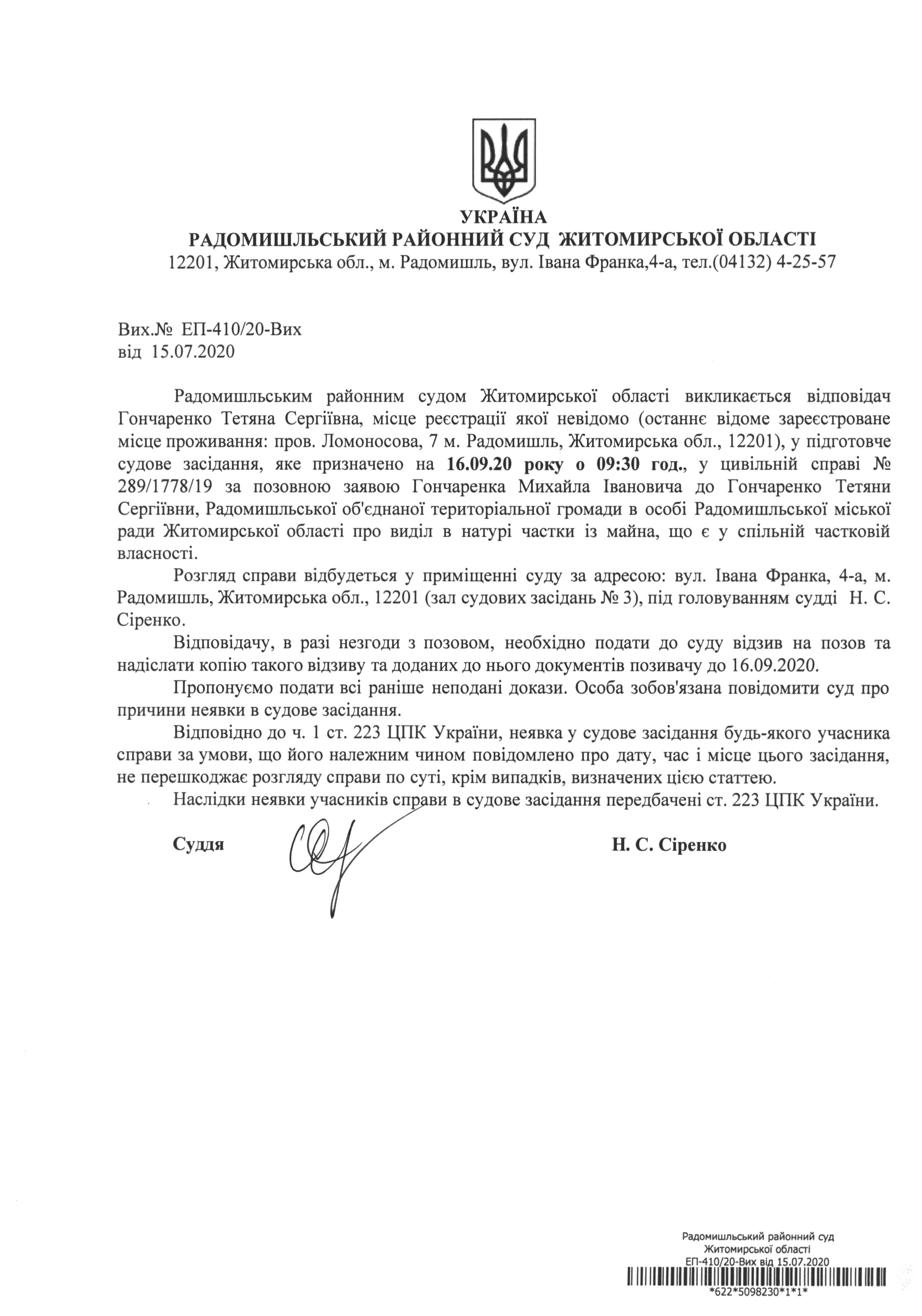 Оголошення про виклик до суду Гончаренко Тетяни Сергіївни у цивільній справі № 289/1778/19 за позовною заявою Гончаренка Михайла Івановича до Гончаренко Тетяни Сергіївни, Радомишльської об'єднаної територіальної громади в особі Радомишльської міської ради Житомирської області про виділ в натурі частки із майна, що є у спільній частковій власності