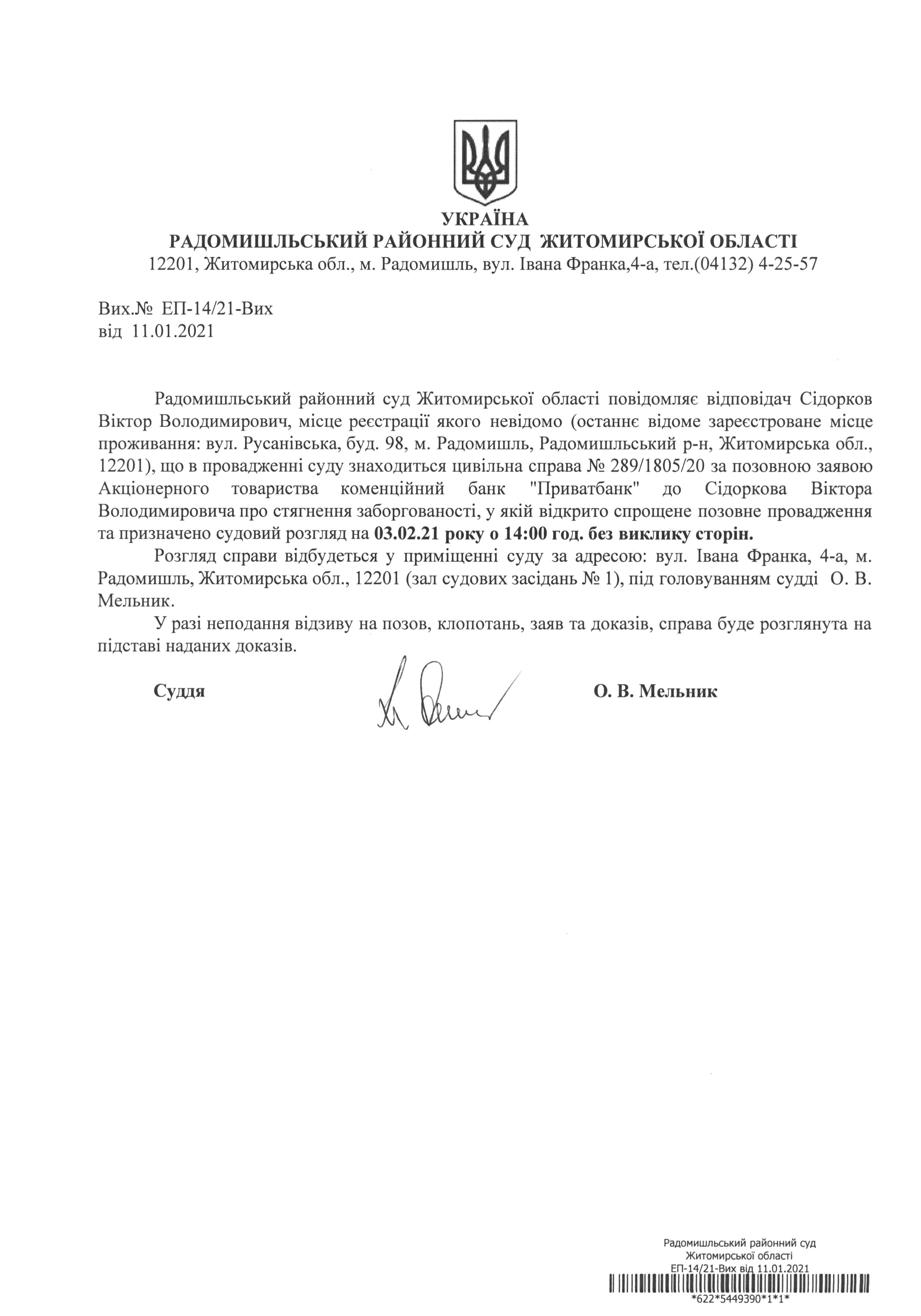 Радомишльський районний суд повідомляє Сідоркова Віктора Володимировича про розгляд цивільної справи № 289/1805/20 за позовною заявою Акціонерного товариства коменційний банк "Приватбанк" до Сідоркова Віктора Володимировича про стягнення заборгованості