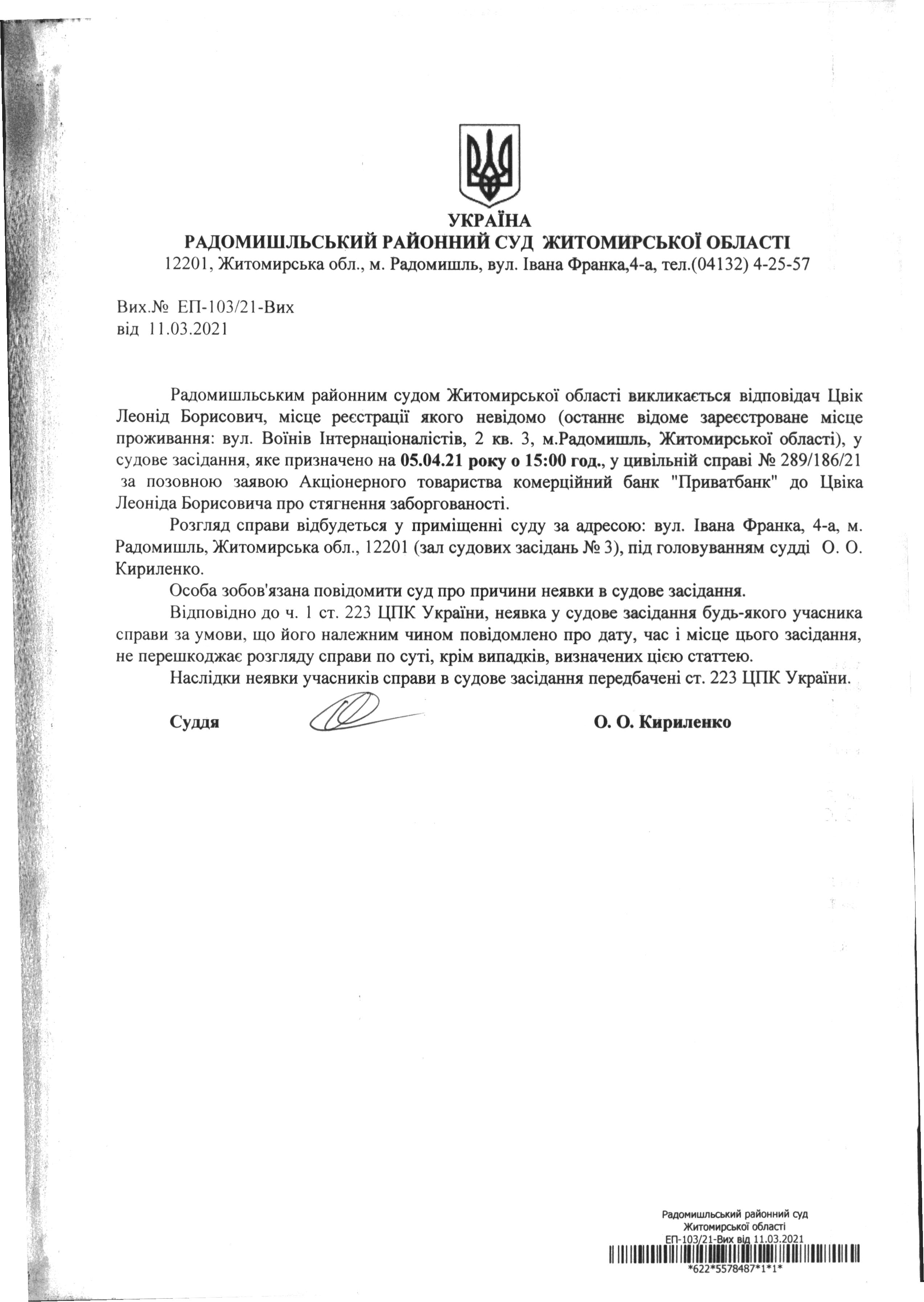 Оголошення про виклик до суду Цвіка Леоніда Борисовича у цивільній справі № 289/186/21 за позовною заявою Акціонерного товариства комерційний банк "Приватбанк" до Цвіка Леоніда Борисовича про стягнення заборгованості