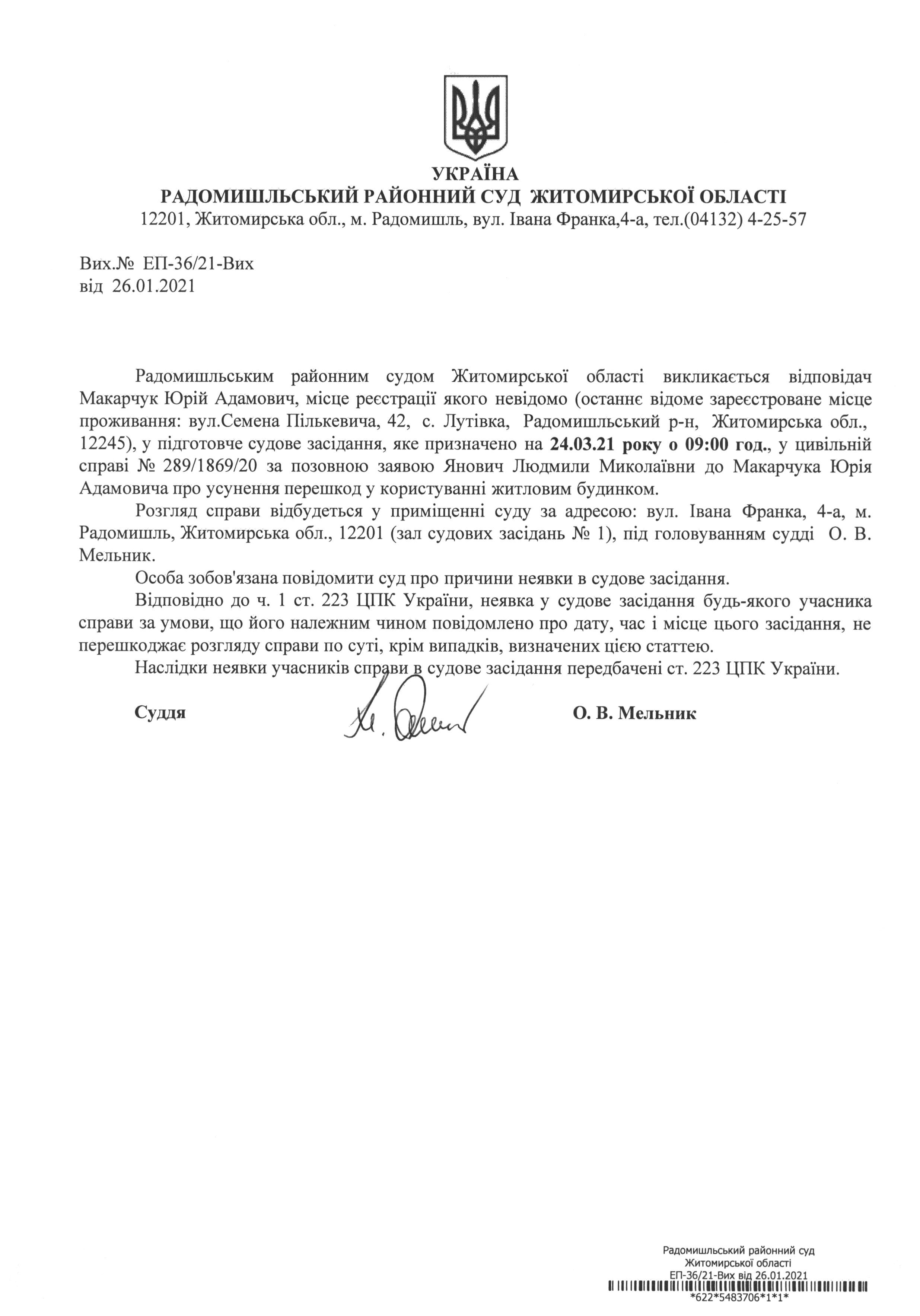 Оголошення про виклик до суду Макарчука Юрія Адамовича у цивільній справі № 289/1869/20 за позовною заявою Янович Людмили Миколаївни до Макарчука Юрія Адамовича про усунення перешкод у користуванні житловим будинком