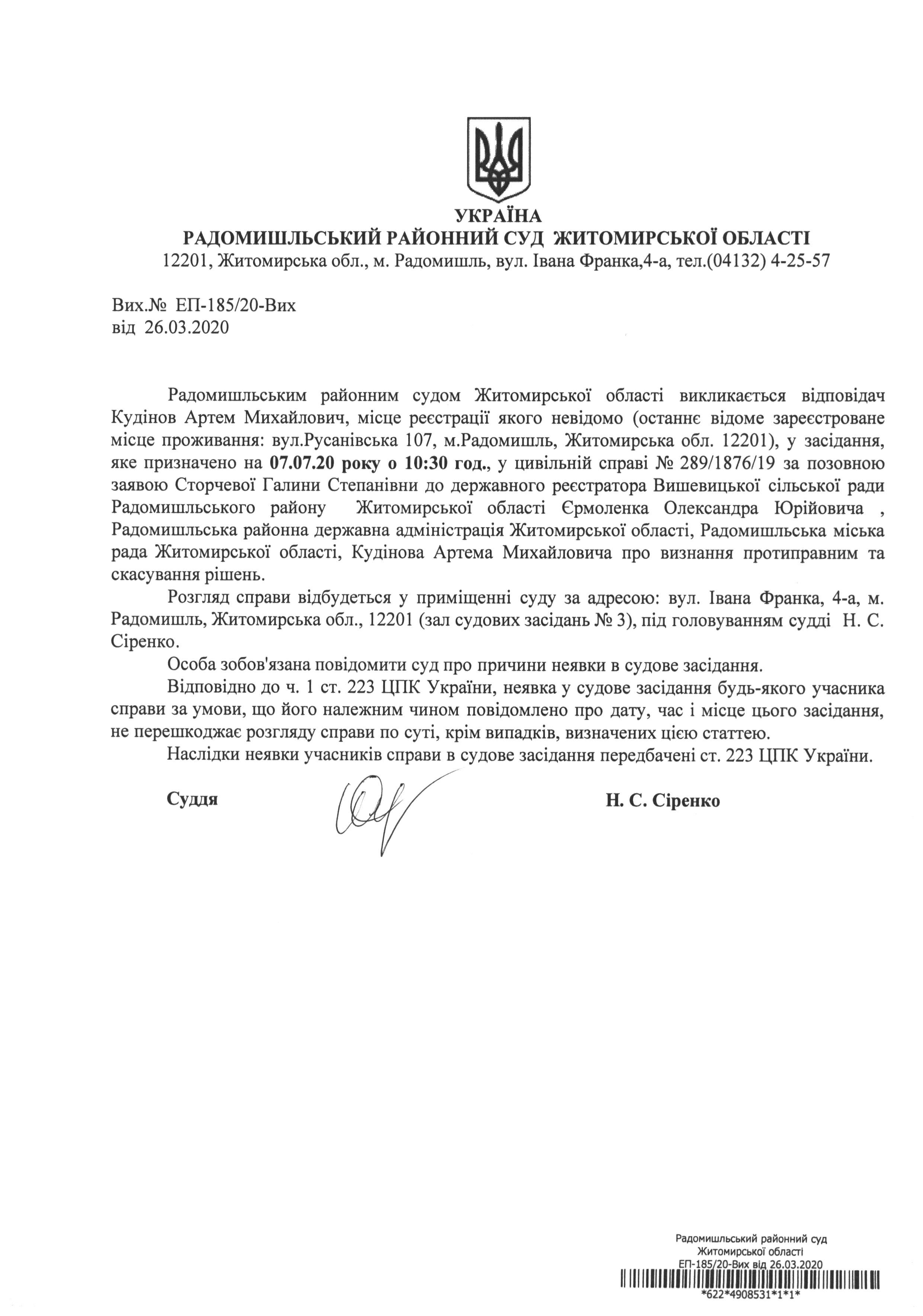 Оголошення про виклик до суду Кудінова Артема Михайловича у цивільній справі № 289/1876/19 за позовною заявою Сторчевої Галини Степанівни до державного реєстратора Вишевицької сільської ради Радомишльського району Житомирської області Єрмоленка Олександра Юрійовича , Радомишльська районна державна адміністрація Житомирської області, Радомишльська міська рада Житомирської області, Кудінова Артема Михайловича про визнання протиправним та скасуванн