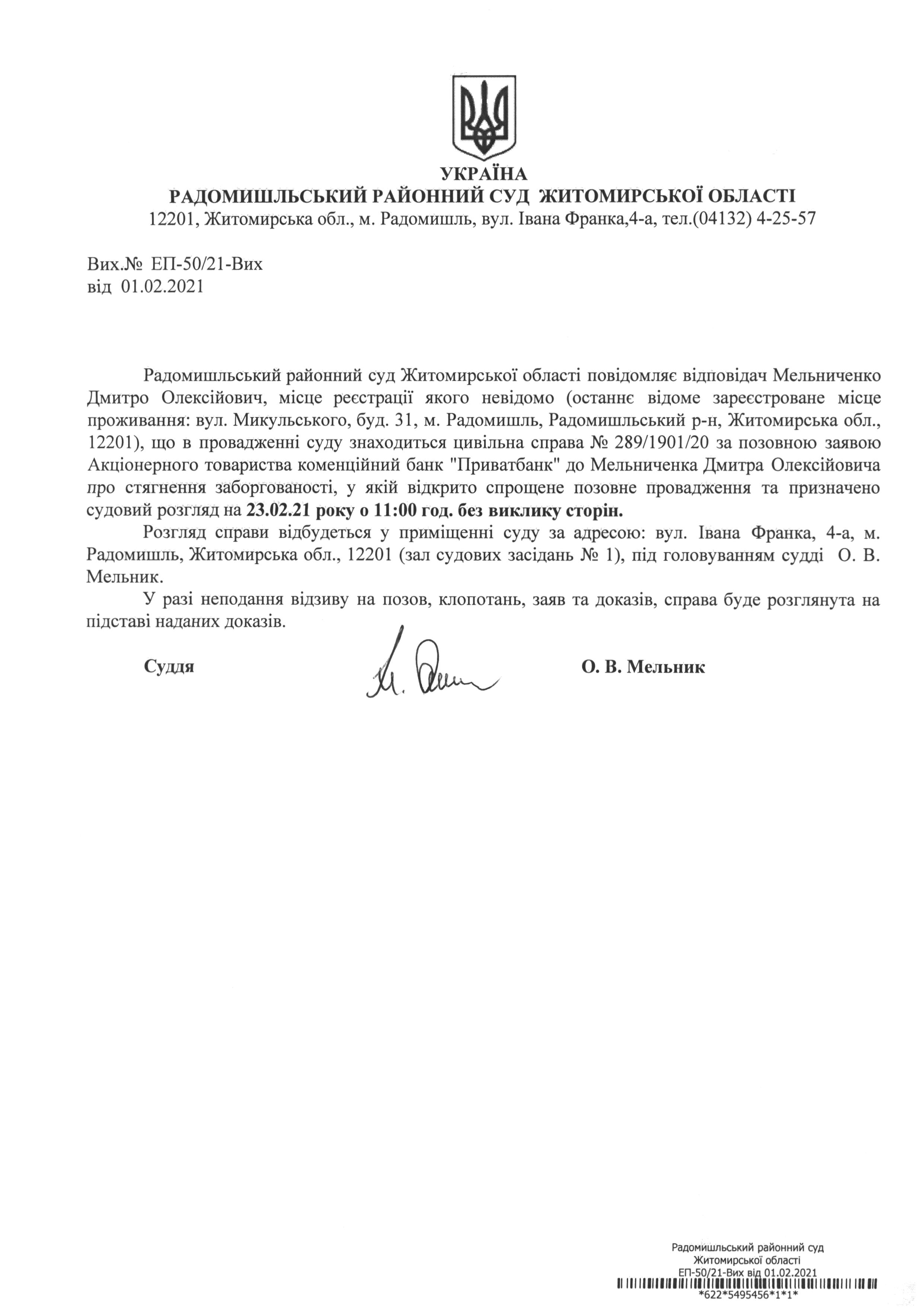 Радомишльський районний суд повідомляє Мельниченка Дмитра Олексійовича про розгляд цивільної справи № 289/1901/20 за позовною заявою Акціонерного товариства коменційний банк "Приватбанк" до Мельниченка Дмитра Олексійовича про стягнення заборгованості