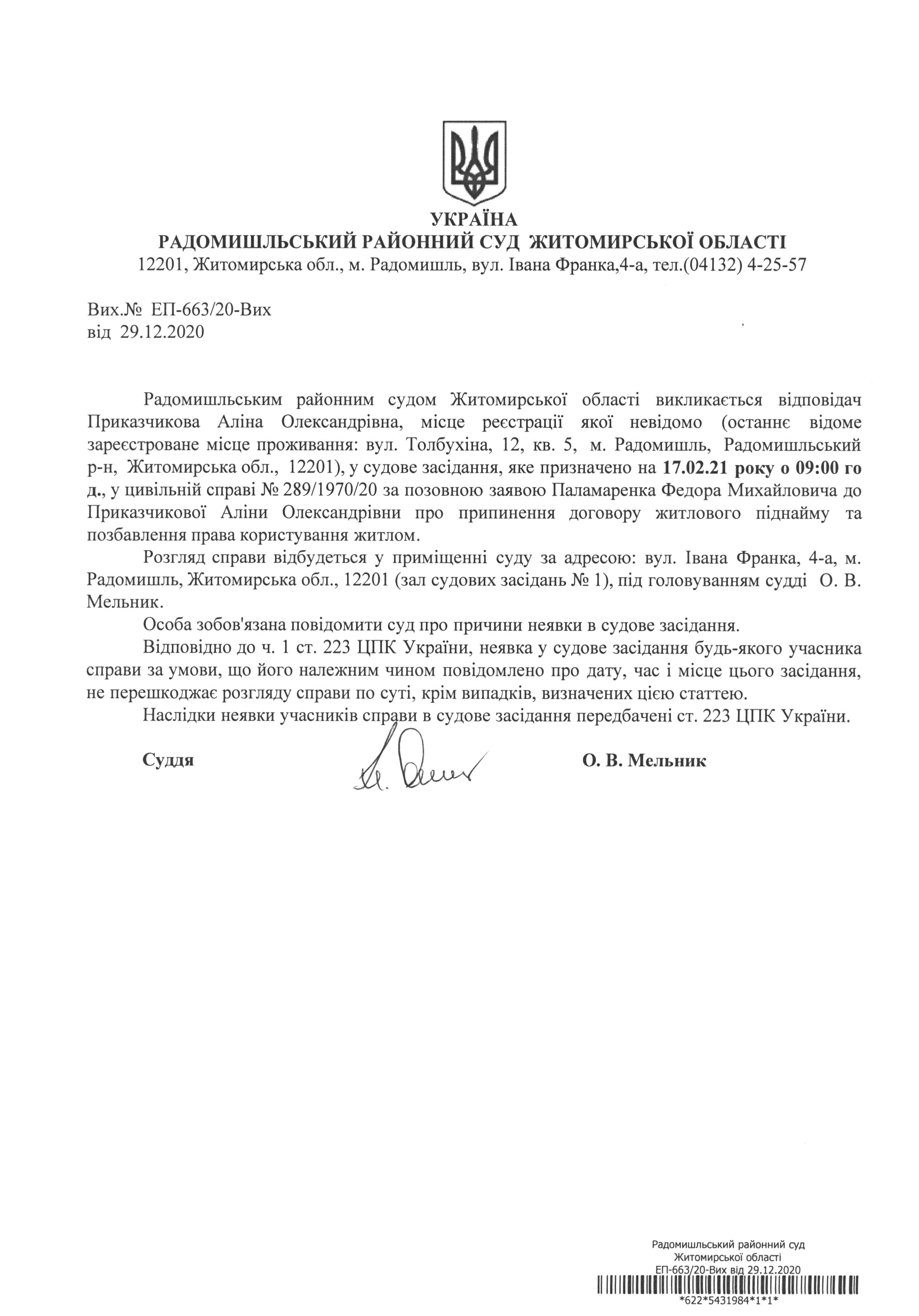 Оголошення про виклик до суду Приказчикова Аліна Олександрівна у цивільній справі № 289/1970/20 за позовною заявою Паламаренка Федора Михайловича до Приказчикової Аліни Олександрівни про припинення договору житлового піднайму та позбавлення права користування житлом