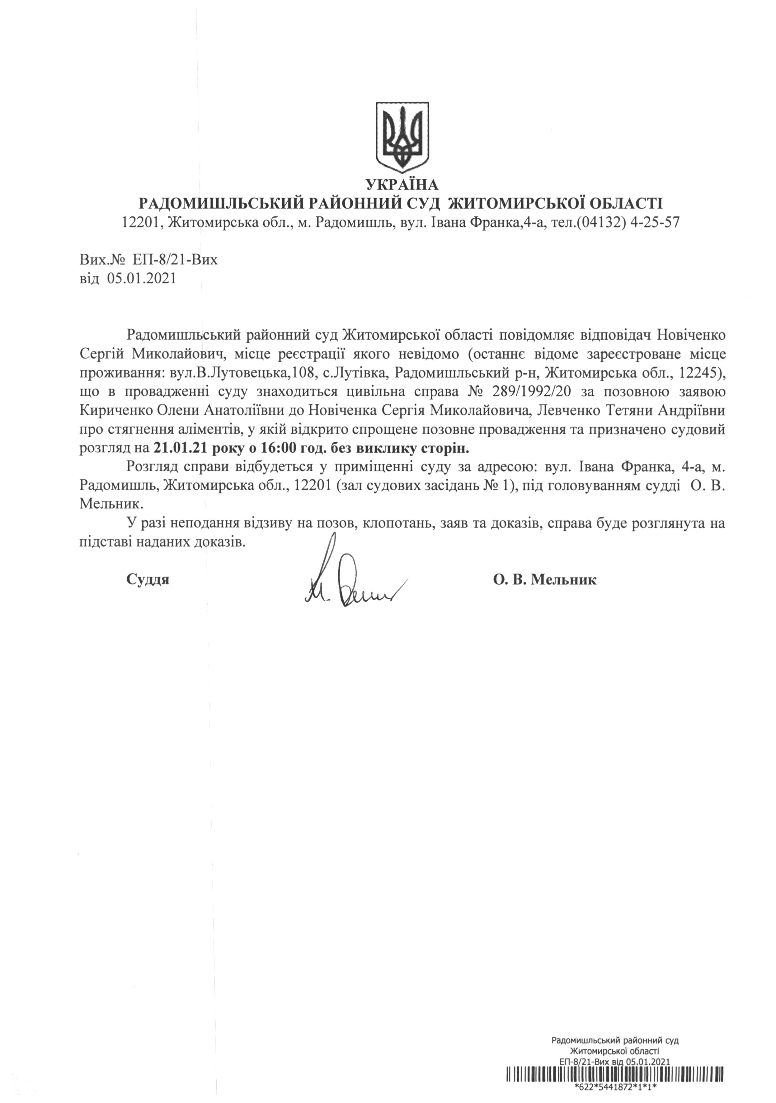 Радомишльський районний суд повідомляє Новіченка Сергія Миколайовича про розгляд цивільної справи № 289/1992/20 за позовною заявою Кириченко Олени Анатоліївни до Новіченка Сергія Миколайовича, Левченко Тетяни Андріївни про стягнення аліментів