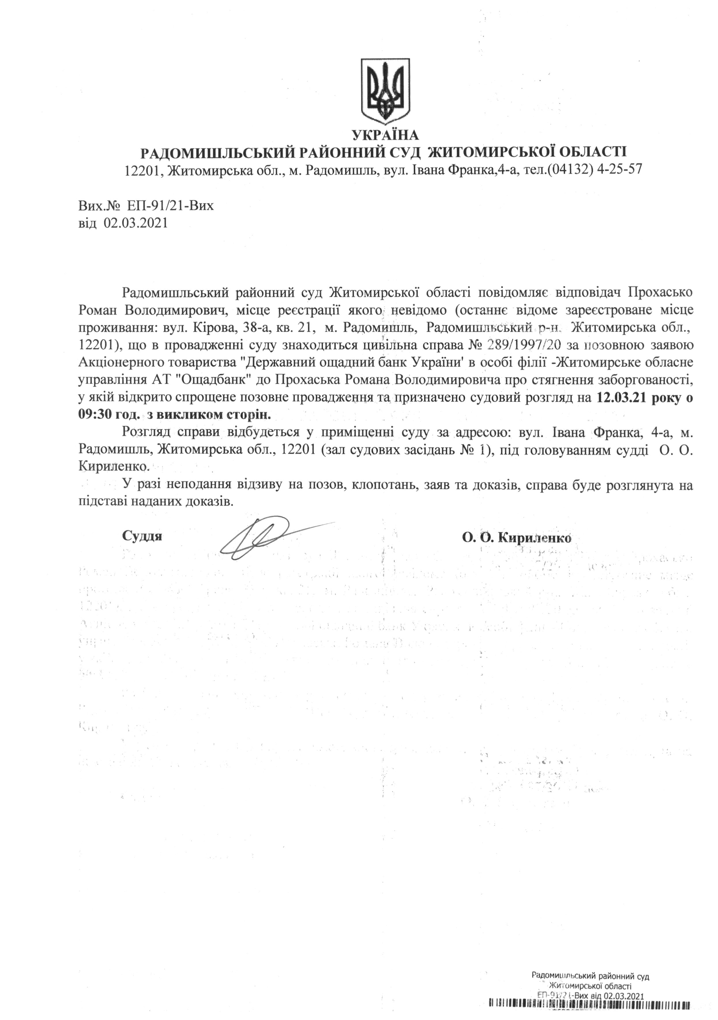 Радомишльський районний суд повідомляє Прохаська Романа Володимировича про розгляд цивільної справи № 289/1997/20 за позовною заявою Акціонерного товариства "Державний ощадний банк України' в особі філії -Житомирське обласне управління АТ "Ощадбанк" до Прохаська Романа Володимировича про стягнення заборгованості
