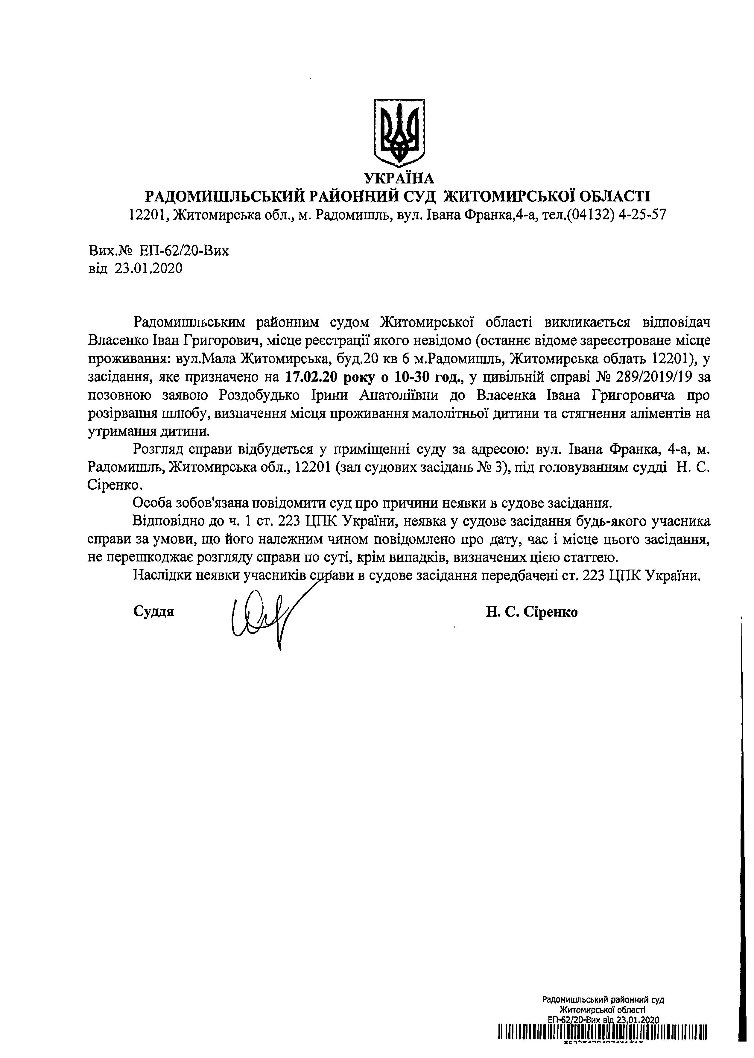 Оголошення про виклик до суду Власенка Івана Григоровича у цивільній справі № 289/2019/19 за позовною заявою Роздобудько Ірини Анатоліївни до Власенка Івана Григоровича про розірвання шлюбу, визначення місця проживання малолітньої дитини та стягнення аліментів на утримання дитини