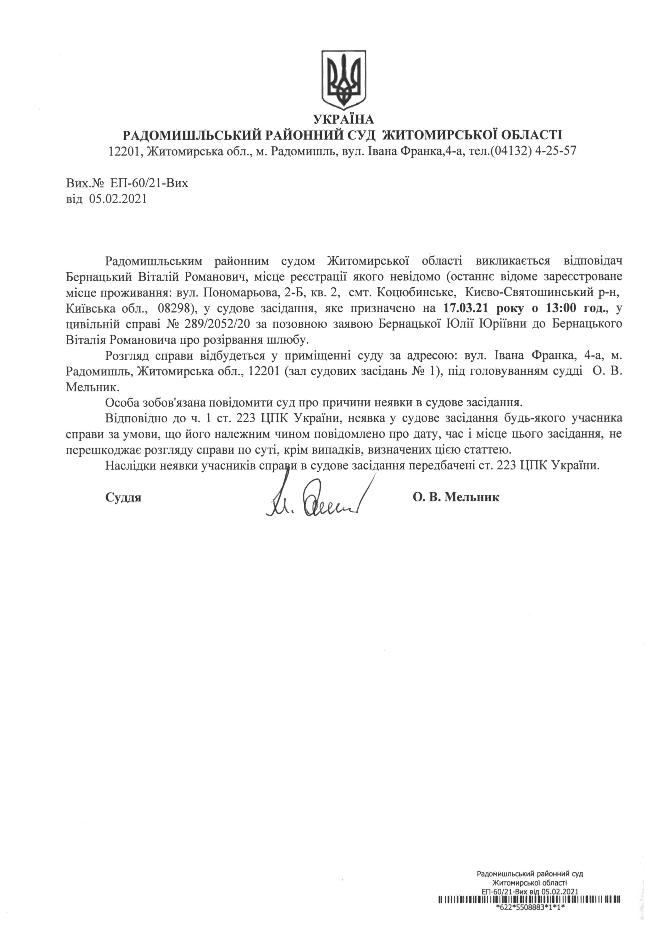 Оголошення про виклик до суду Бернацького Віталія Романовича у цивільній справі № 289/2052/20 за позовною заявою Бернацької Юлії Юріївни до Бернацького Віталія Романовича про розірвання шлюбу.
