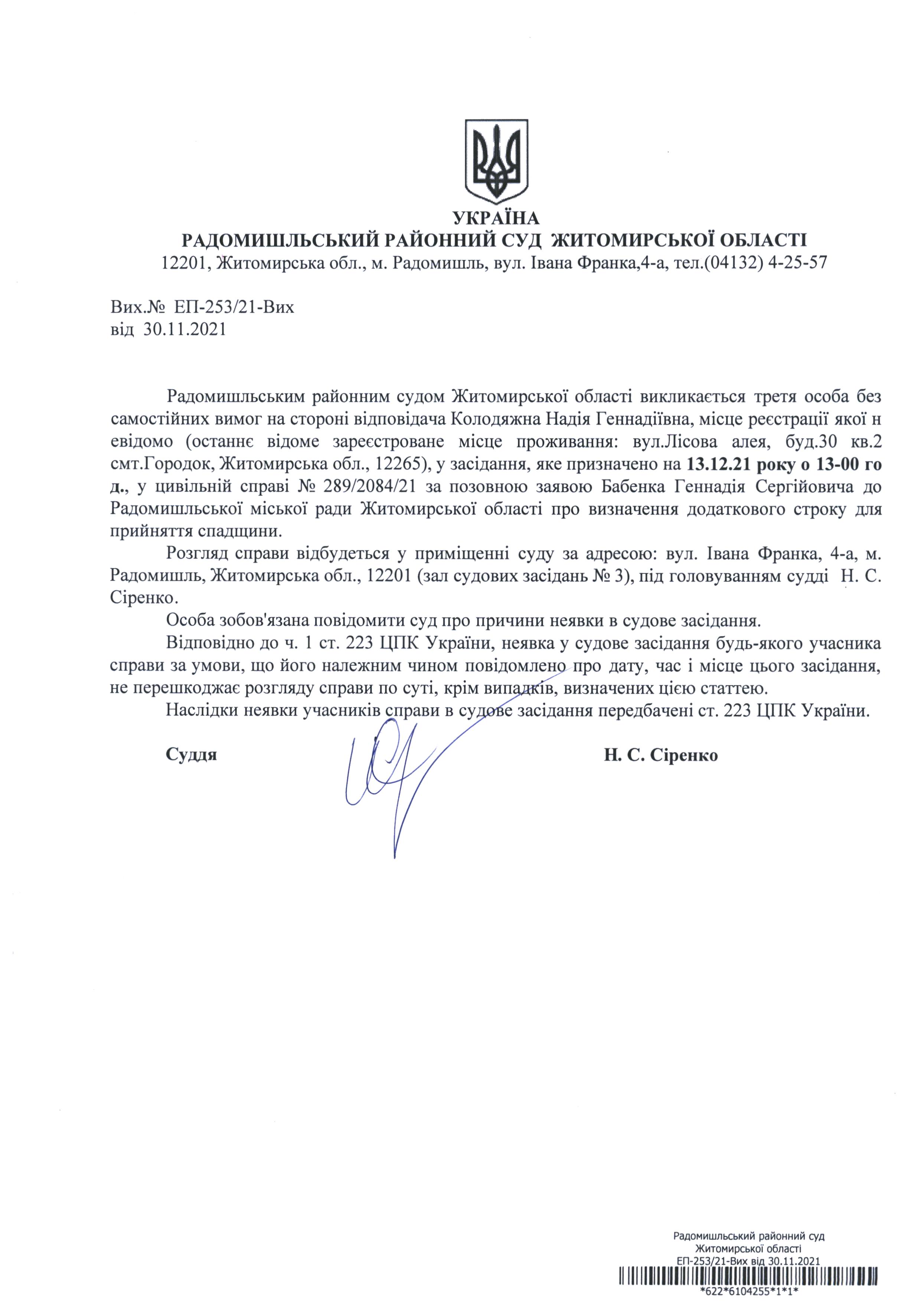 Оголошення про виклик до судуКолодяжної Надії Геннадіївни у цивільній справі № 289/2084/21 за позовною заявою Бабенка Геннадія Сергійовича до Радомишльської міської ради Житомирської області про визначення додаткового строку для прийняття спадщини