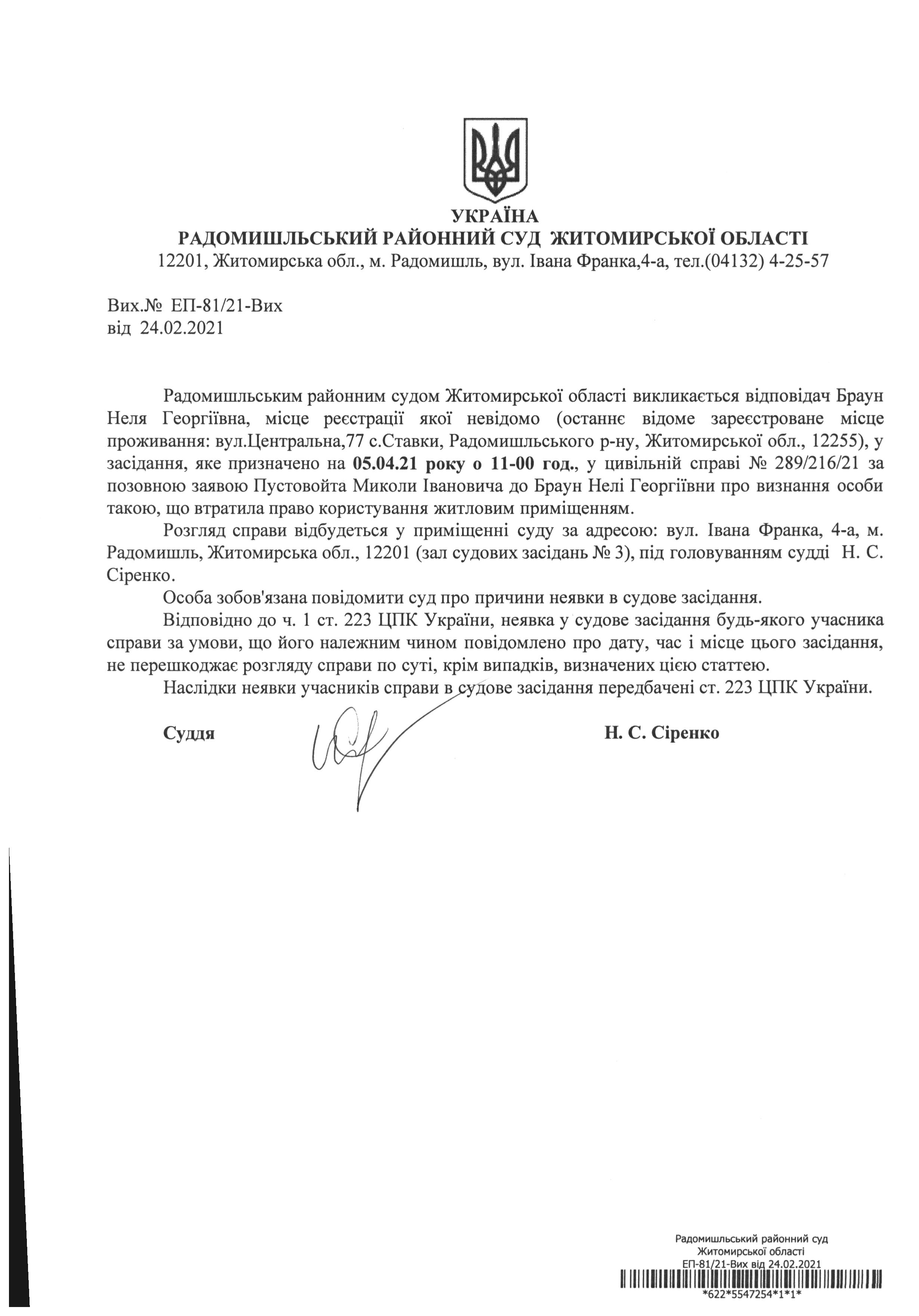 Оголошення про виклик до суду Браун Нелі Георгіївни у цивільній справі № 289/216/21 за позовною заявою Пустовойта Миколи Івановича до Браун Нелі Георгіївни про визнання особи такою, що втратила право користування житловим приміщенням