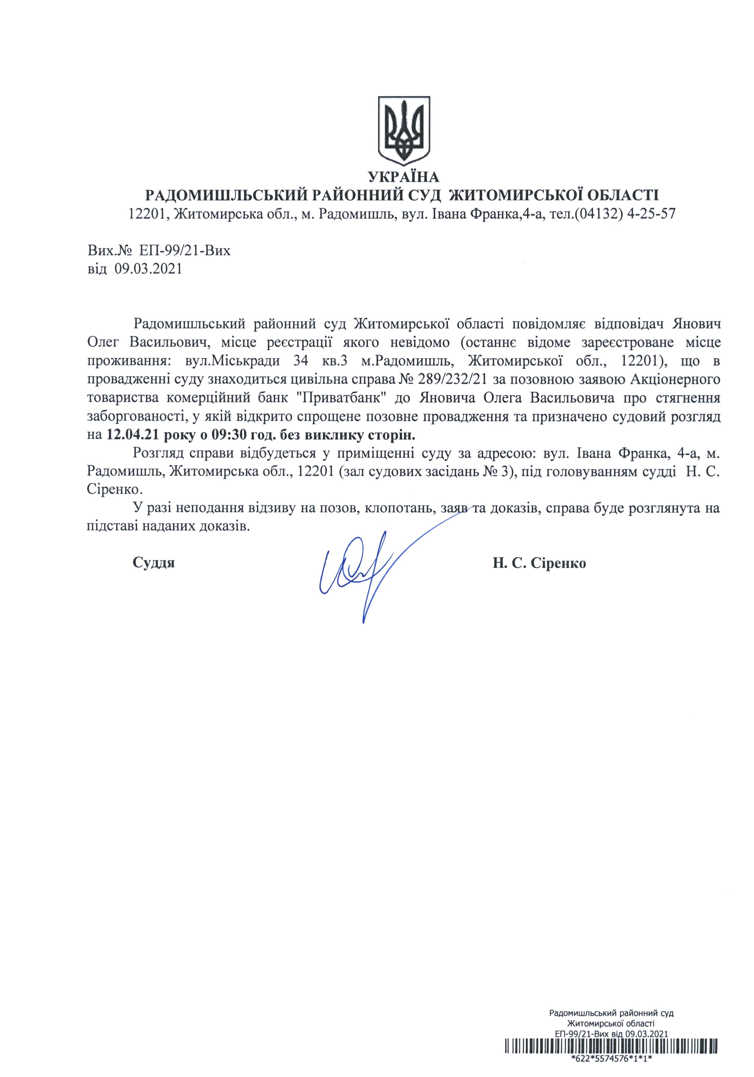 Радомишльський районний суд повідомляє Яновича Олега Васильовича про розгляд цивільної справи № 289/232/21 за позовною заявою Акціонерного товариства комерційний банк "Приватбанк" до Яновича Олега Васильовича про стягнення заборгованості