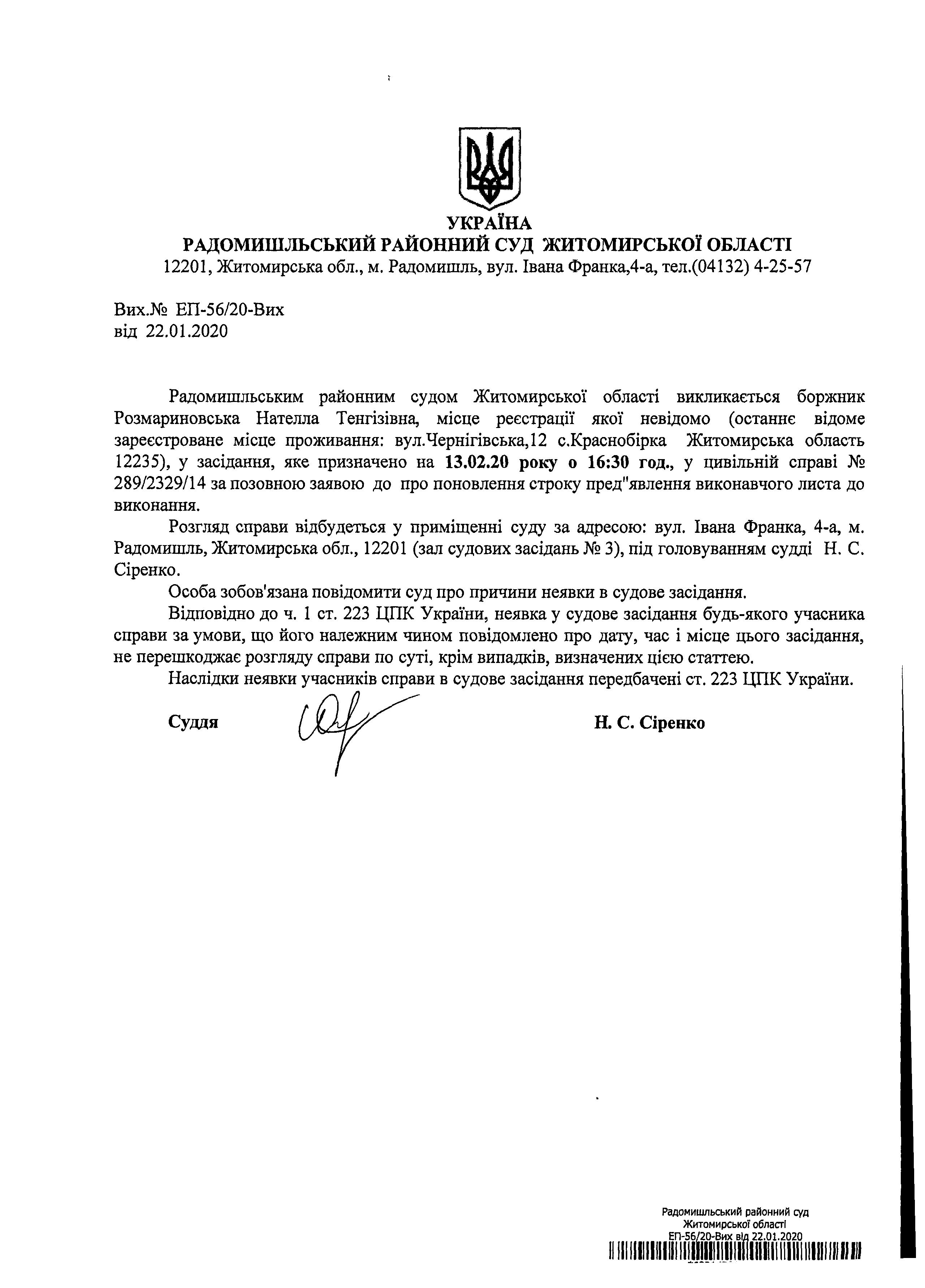 Оголошення про виклик до суду Розмариновської Нателли Тенгізівни у цивільній справі № 289/2329/14 за позовною заявою про поновлення строку пред"явлення виконавчого листа до виконання
