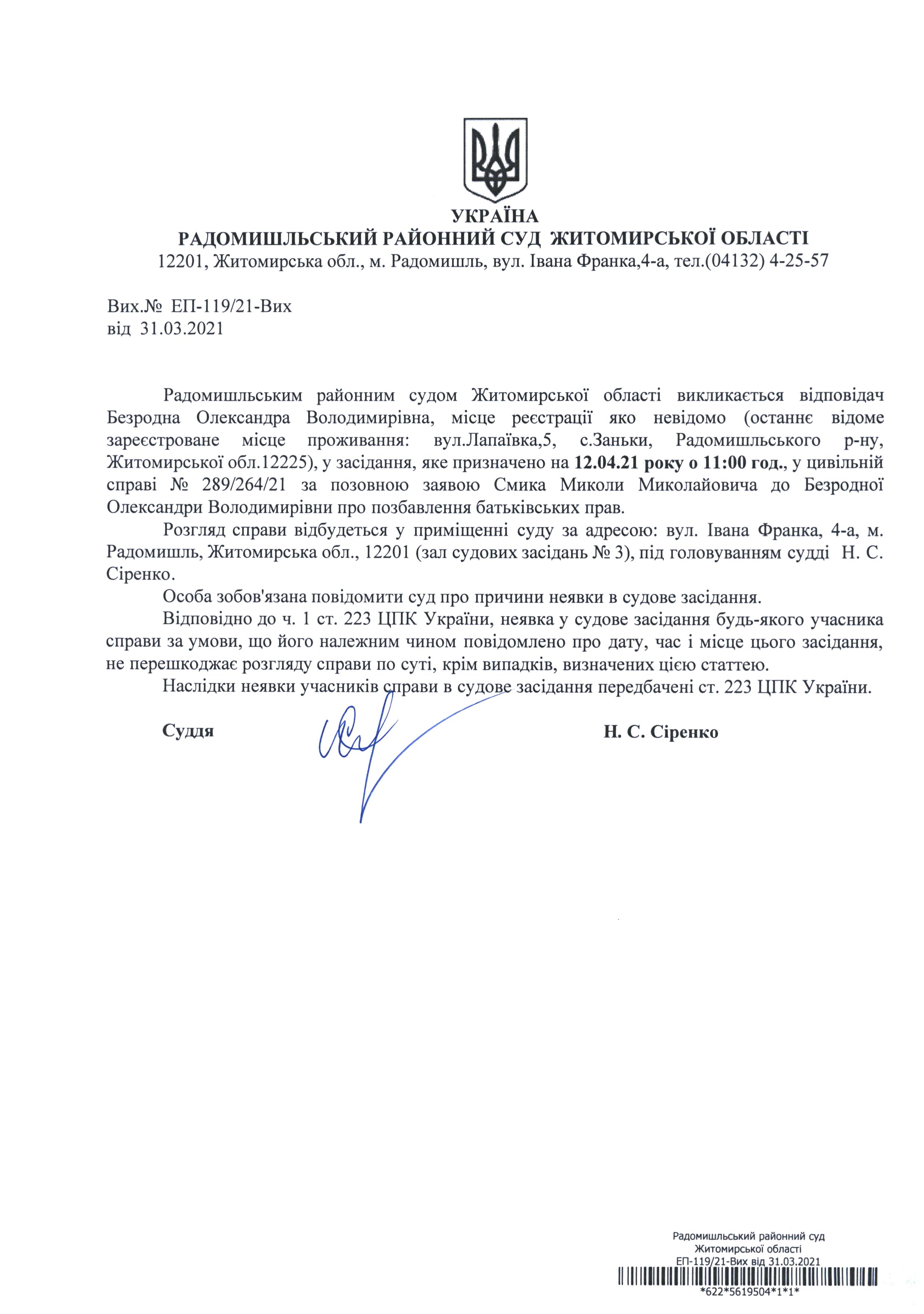 Оголошення про виклик до суду Безродної Олександри Володимирівни у цивільній справі № 289/264/21 за позовною заявою Смика Миколи Миколайовича до Безродної Олександри Володимирівни про позбавлення батьківських прав