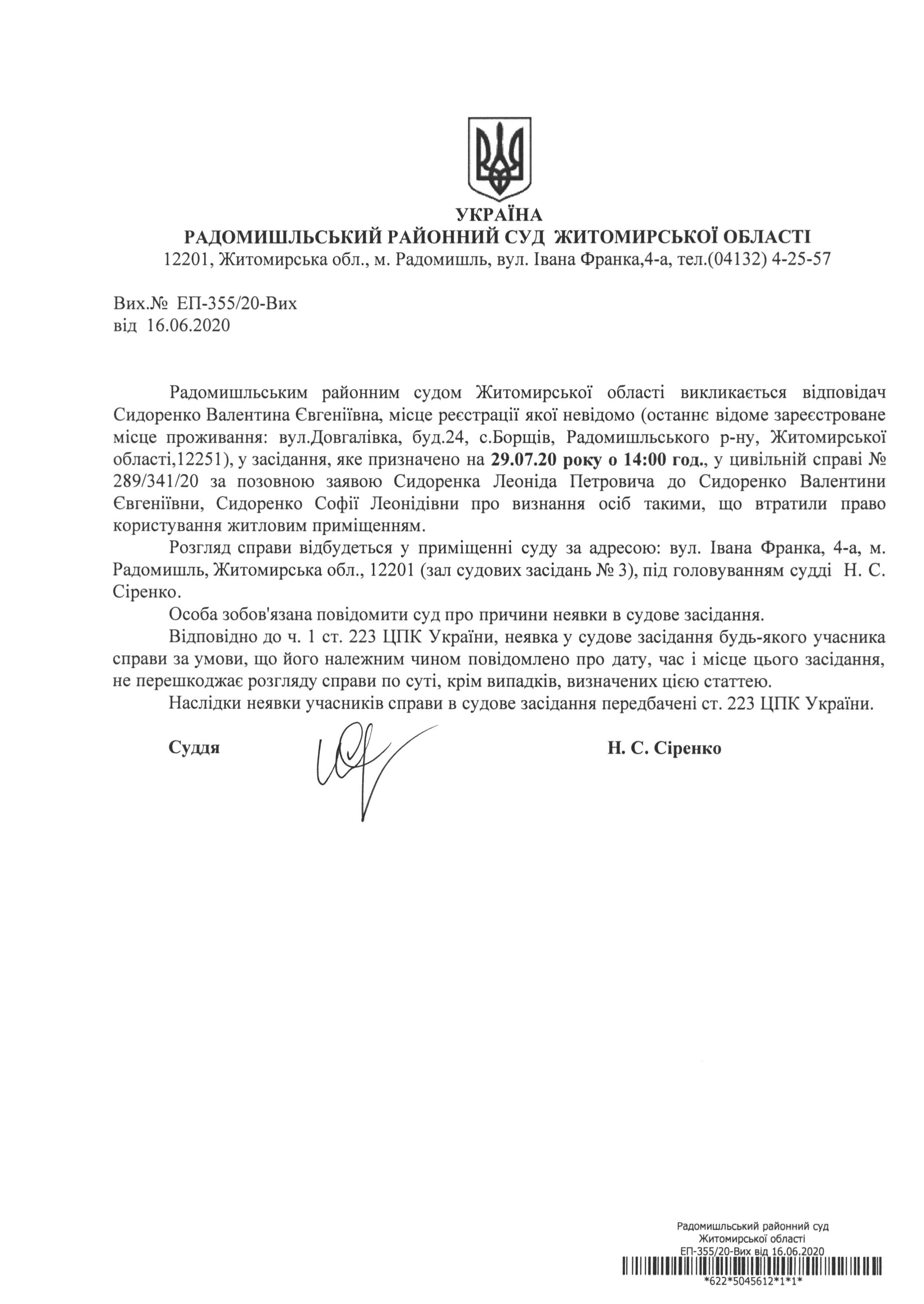 Оголошення про виклик до суду Сидоренко Валентини Євгеніївни у цивільній справі № 289/341/20 за позовною заявою Сидоренка Леоніда Петровича до Сидоренко Валентини Євгеніївни, Сидоренко Софії Леонідівни про визнання осіб такими, що втратили право користування житловим приміщенням