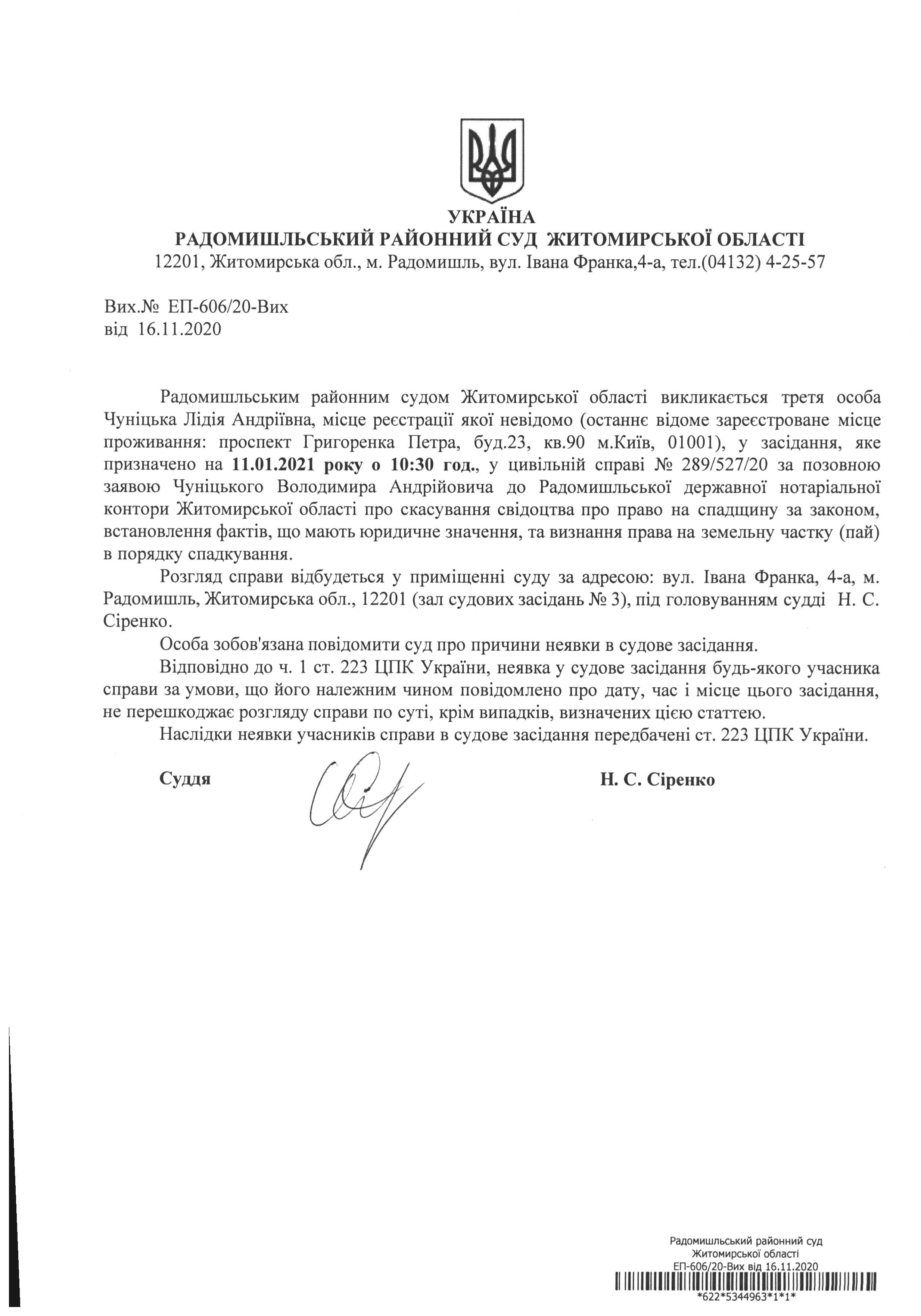 Оголошення про виклик до суду третьої особи Чуніцької Лідії Андріївни у цивільній справі № 289/527/20 за позовною заявою Чуніцького Володимира Андрійовича до Радомишльської державної нотаріальної контори Житомирської області про скасування свідоцтва про право на спадщину за законом, встановлення фактів, що мають юридичне значення, та визнання права на земельну частку (пай) в порядку спадкування