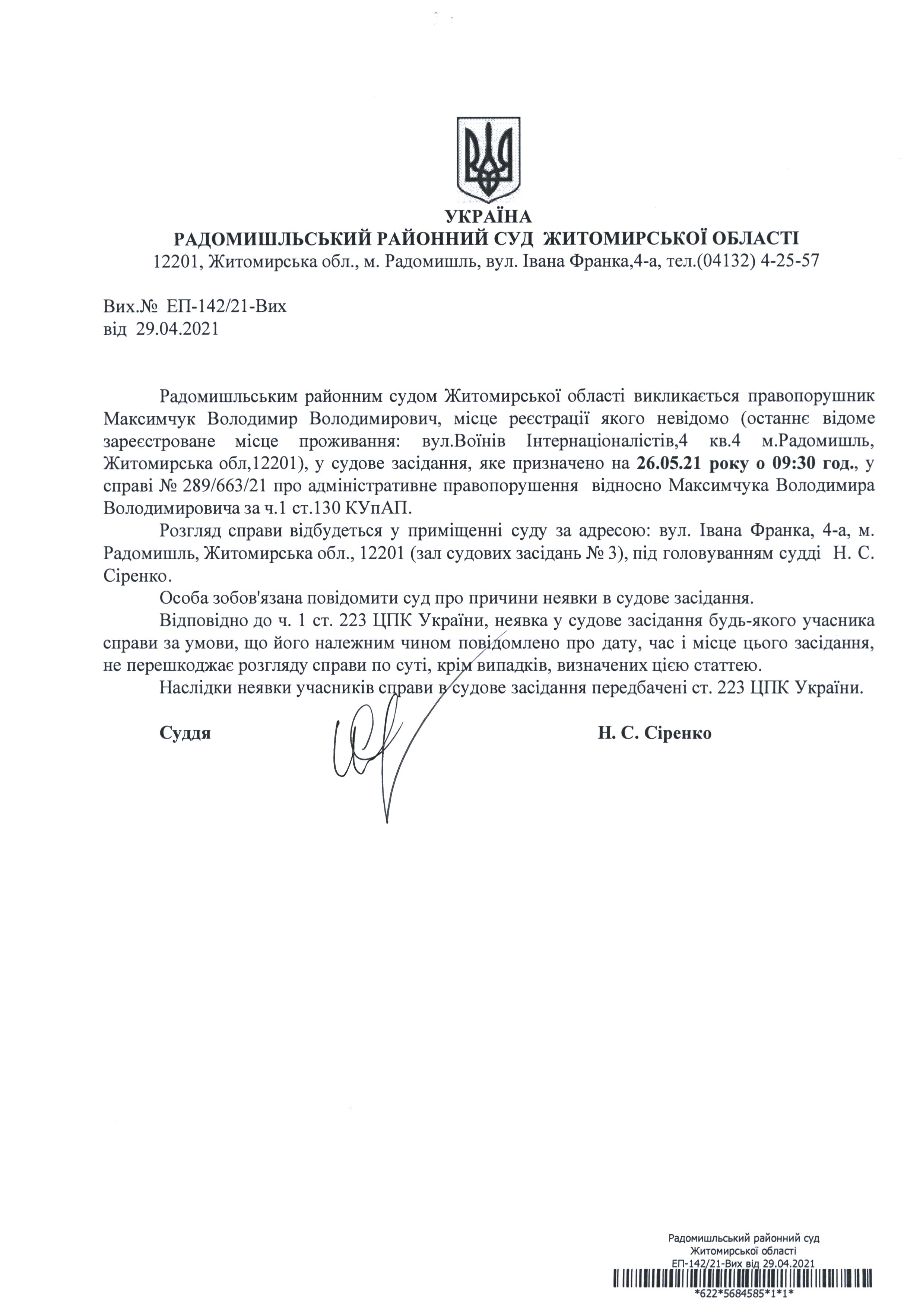 Оголошення про виклик до суду Максимчука Володимира Володимировича у справі № 289/663/21 про адміністративне правопорушення відносно Максимчука Володимира Володимировича за ч.І ст.ІЗОКУпАП