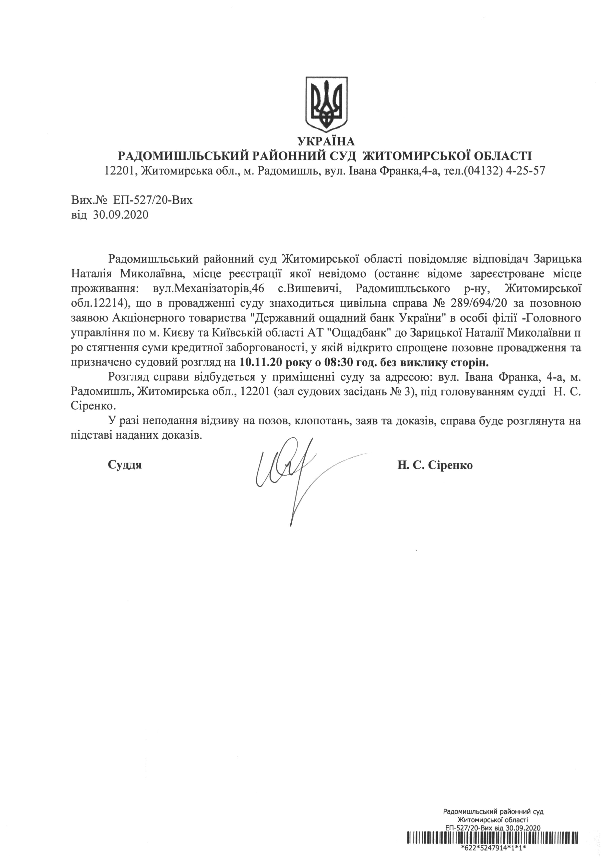 Радомишльський районний суд повідомляє Зарицьку Наталію Миколаївну про розгляд цивільної справи № 289/694/20 за позовною заявою Акціонерного товариства "Державний ощадний банк України" в особі філії -Головного управління по м. Києву та Київській області АТ "Ощадбанк" до Зарицької Наталії Миколаївни п ро стягнення суми кредитної заборгованості